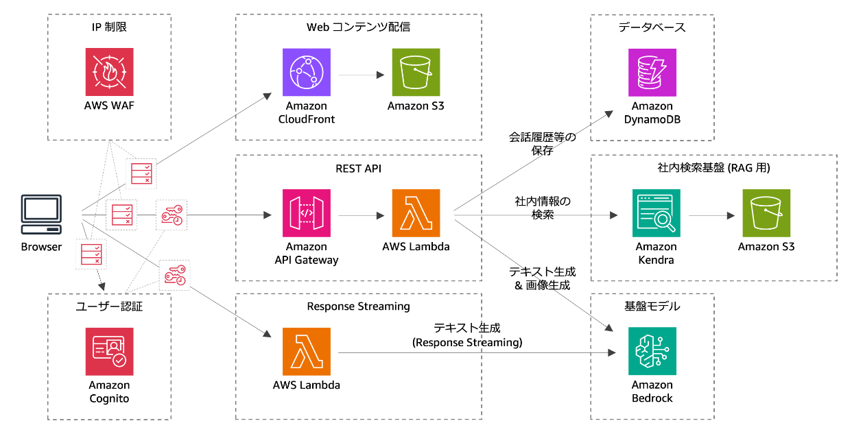 AWS 上に構築し、社内データを活用したチャットボットや要約、文章校正、画像生成などの