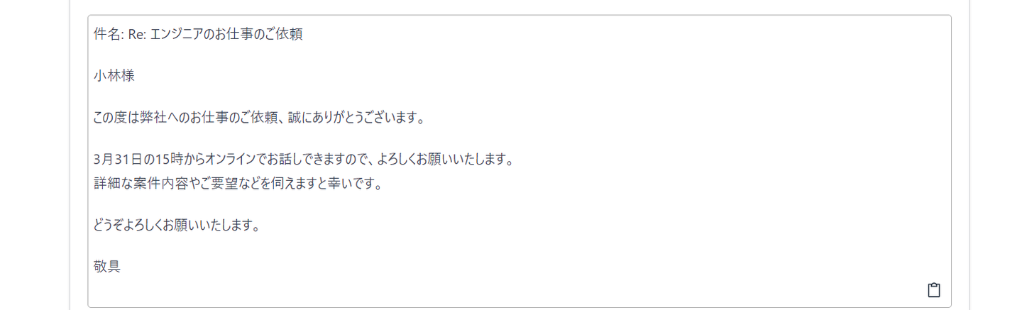 そうすると以下のような返信メールを自動で作成してくれます。命令の条件によっても変わりますし、同じ命令でも何パターンか用意してくれます。