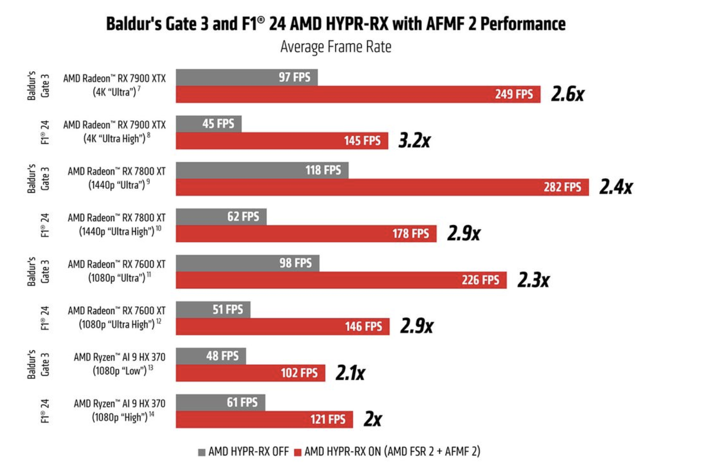 DLSSやFSRが低解像度の絵を描いてそれを高解像度に引き延ばすのに対し、AFMFは フレーム(絵)自体を自動生成し、それを紙芝居の間に織り交ぜる というアプローチをとっています。この機能はグラボのドライバ(グラボを正常に動かすためのプログラムみたいなものです)で実装されるので、 ゲーム側での対応が不要 というメリットがあります。結果的にどんなゲームでも一定の効果が見込めるというのが特長のようです。以下AMDの説明ページにある資料となりますが、とあるゲームにおいて、AFMF2を有効とすることで、FPSがとても上がっていることがわかります。また赤帯の説明に 「FSR2とAFMF2がON」 となっているように、この技術は FSRと組み合わせて使うことが出来る ようです。