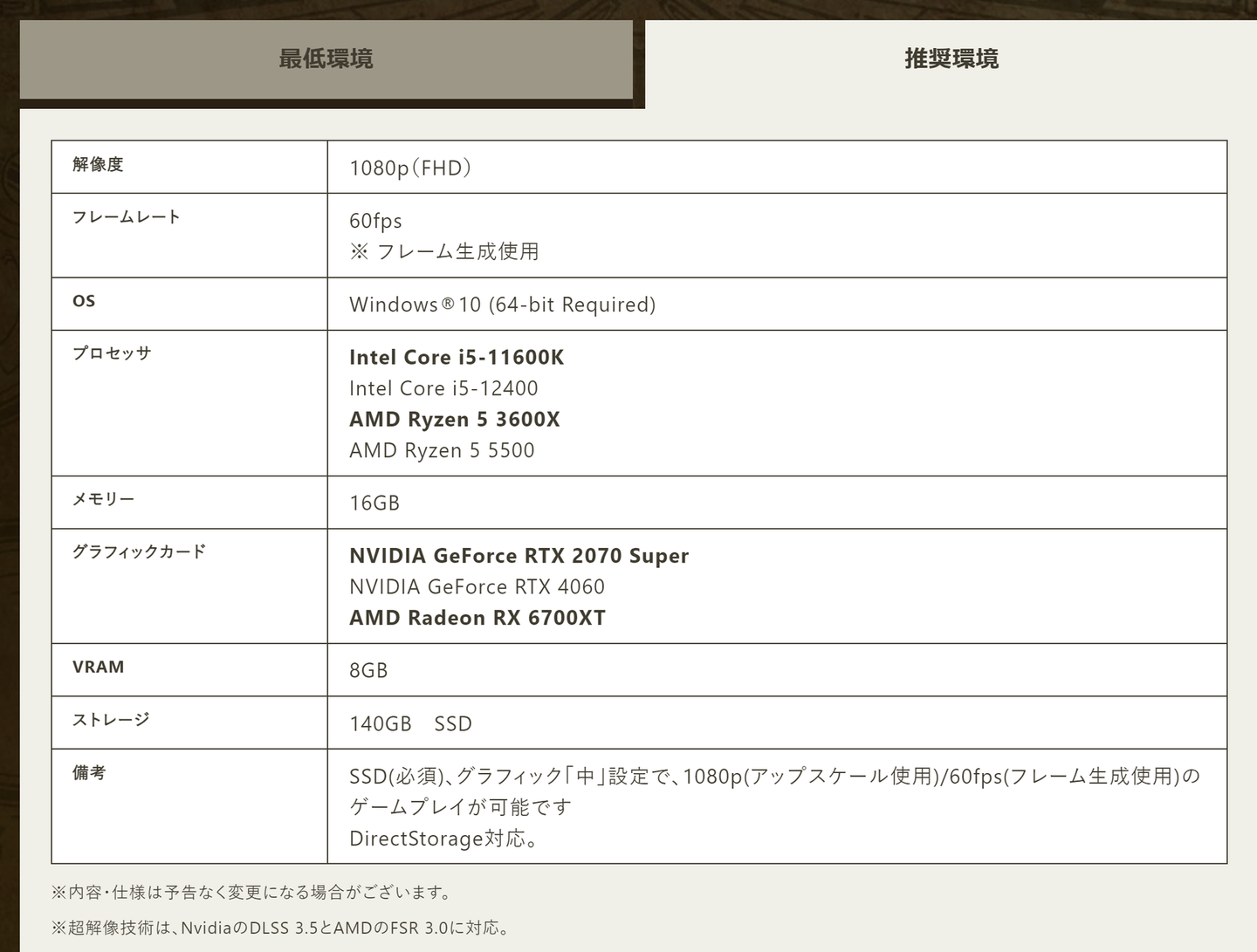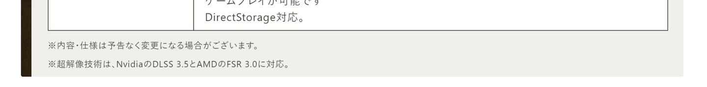 ちなみに最初に表示したモンハンワイルズのスペック表の下にも対応が書いてありますね。モンハンワイルズは DLSS,FSR両方に対応している ようです。