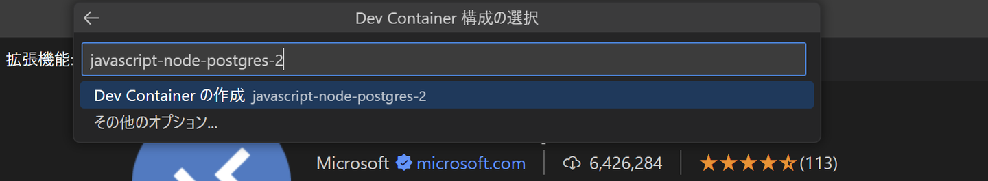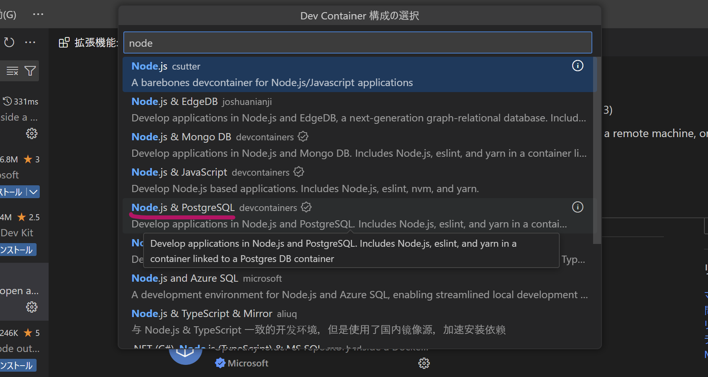 例えば、Node.JS+PostgreSQL入れた開発コンテナーを作ってみます。新しい開発コンテナーを選択した後で「node」と入れて、 「Node.js+PostgreSQL」 を選択します。