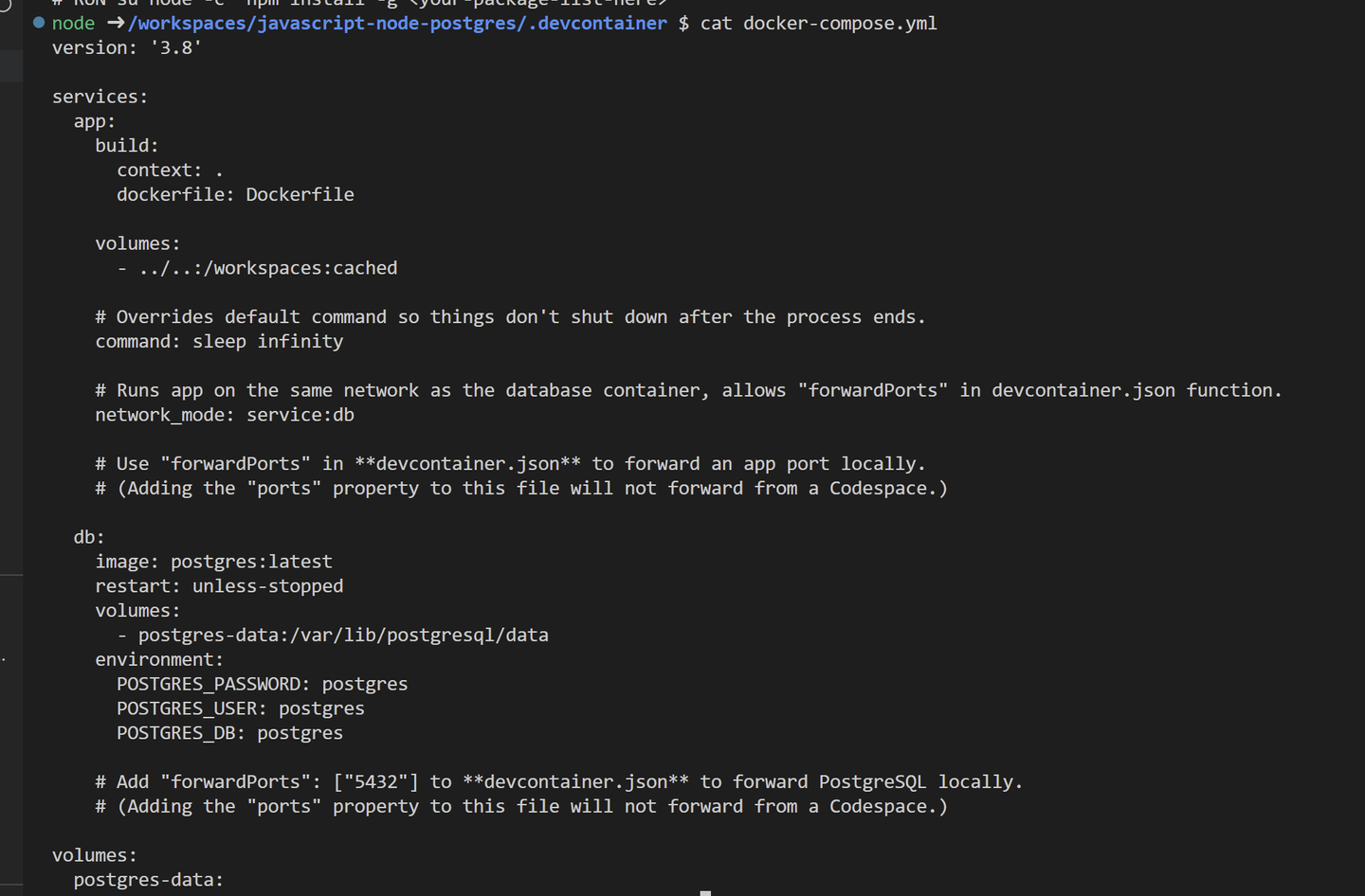 こちらは、appコンテナとdbコンテナの設定が書かれていますね。appは先ほどのDockerFileをもとに構築、dbはpostgresイメージをそのまま利用しているようです。USERやPASSもデフォルトで設定してくれるようです。