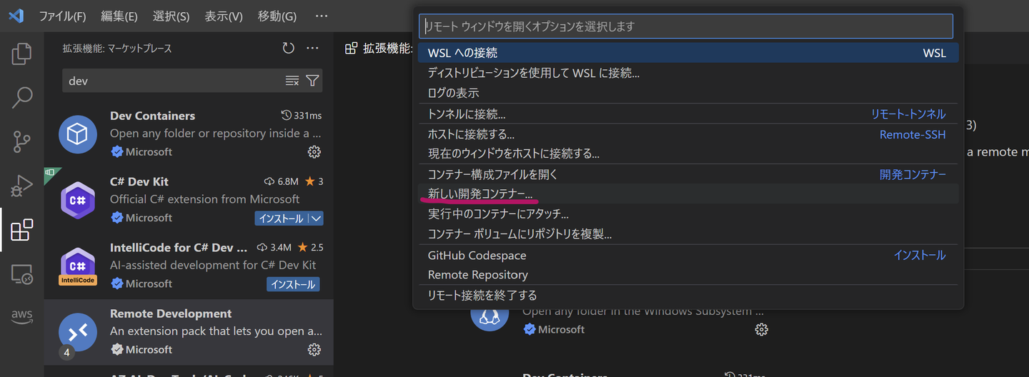 6.さっそく試してみる 使い方なのですが、左下の緑の部分(WSL:Ubuntuとなっているところをクリック)から表示される 「新しい開発コンテナー」 もしくは、パレットコマンド(Ctrl+Shift+p)で 「Dev Containers」 を選択します。