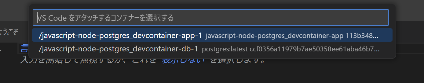 同様に、DBコンテナの方にも入ってみます。 右下がWSLとなっているVSCodeのウィンドウ で 「実行中のコンテナにアタッチ」 で今度は db-1 の方を選択します。