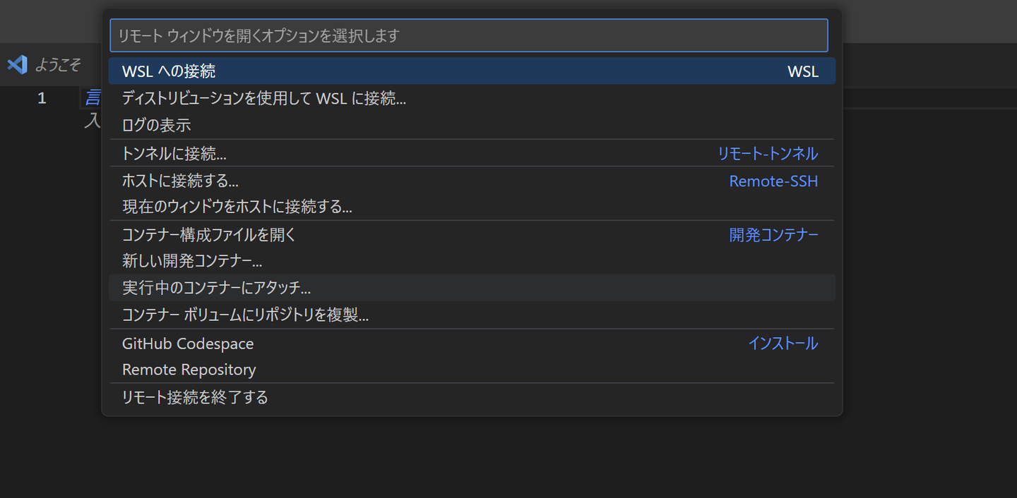 WSLで立ち上げたLinux上で 「code .」 と押せばVSCodeが立ち上がりますし、VSCode側からでも 「WSLに接続」 を押すことでWSLに接続できます。