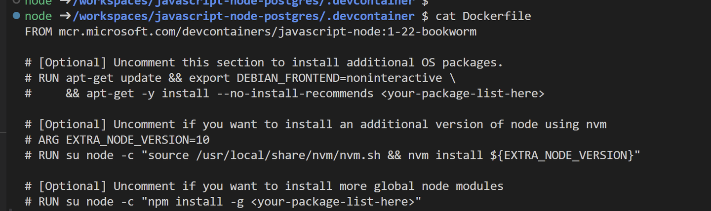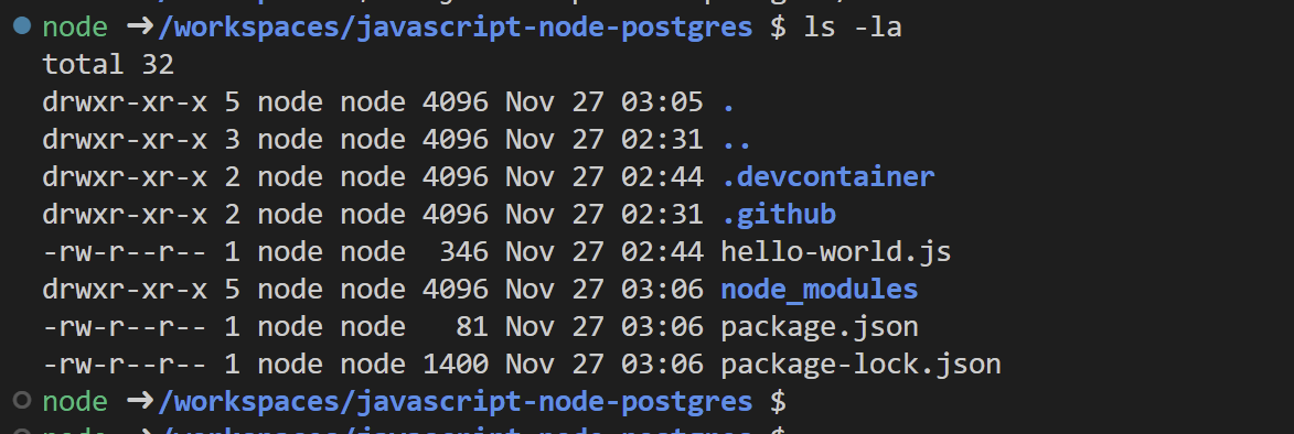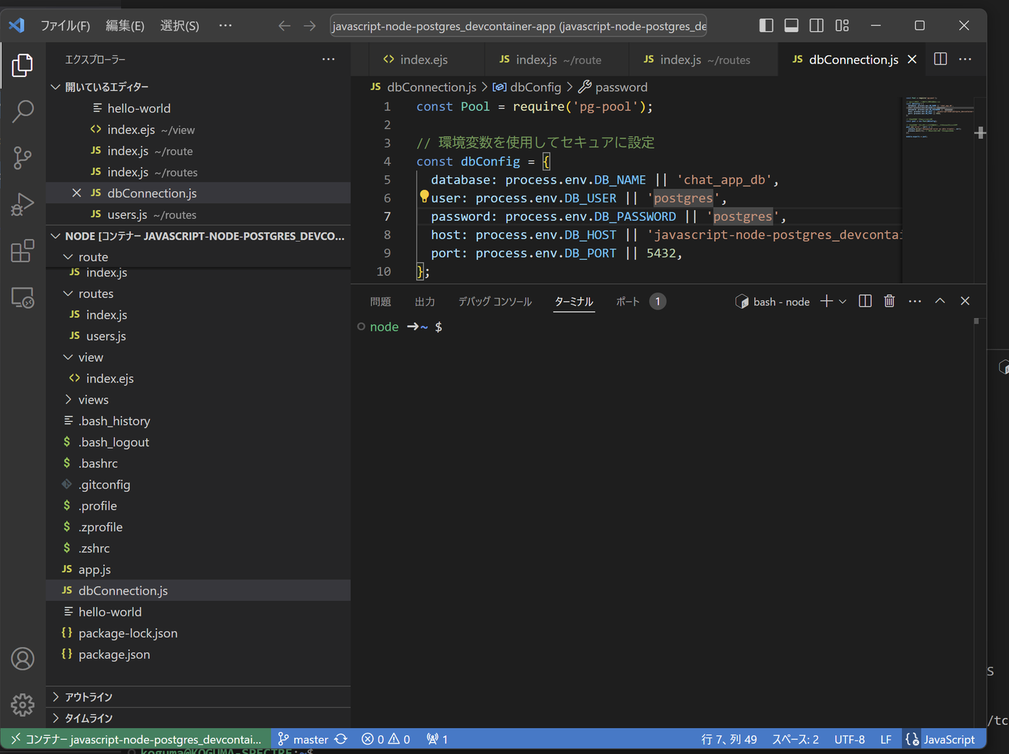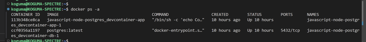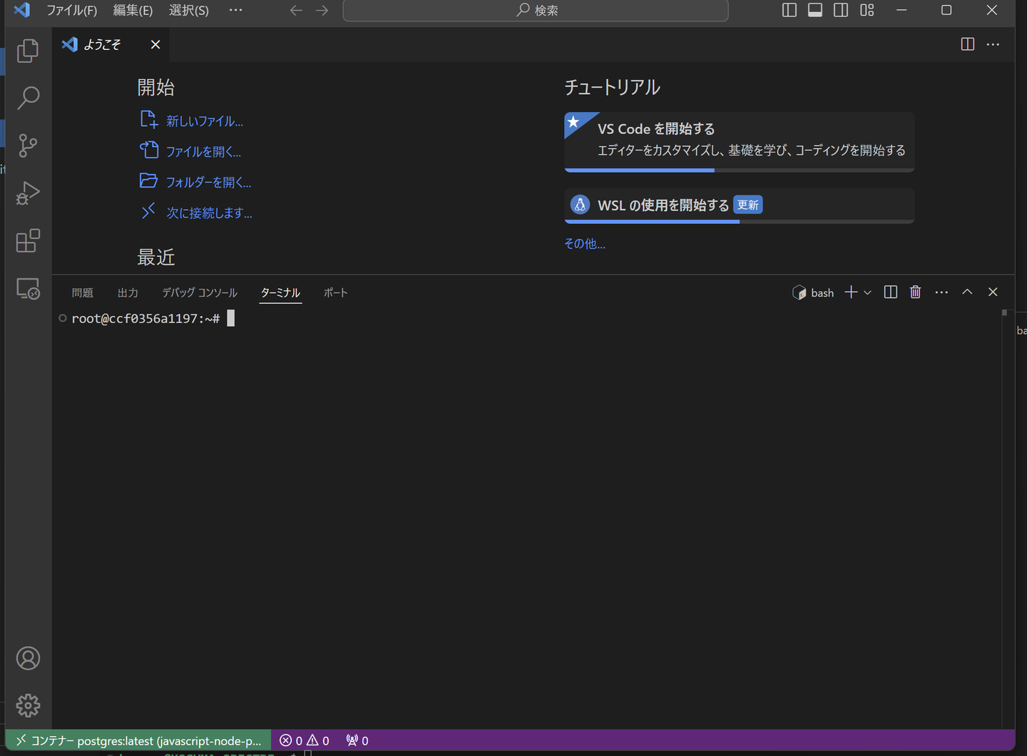 今回は、NodeJSのAPPコンテナと、PostgresのDBコンテナとなります。 右下が「WSL:Ubuntu」となっているVSCodeのウィンドウ で、以下コマンドを実行してみます。