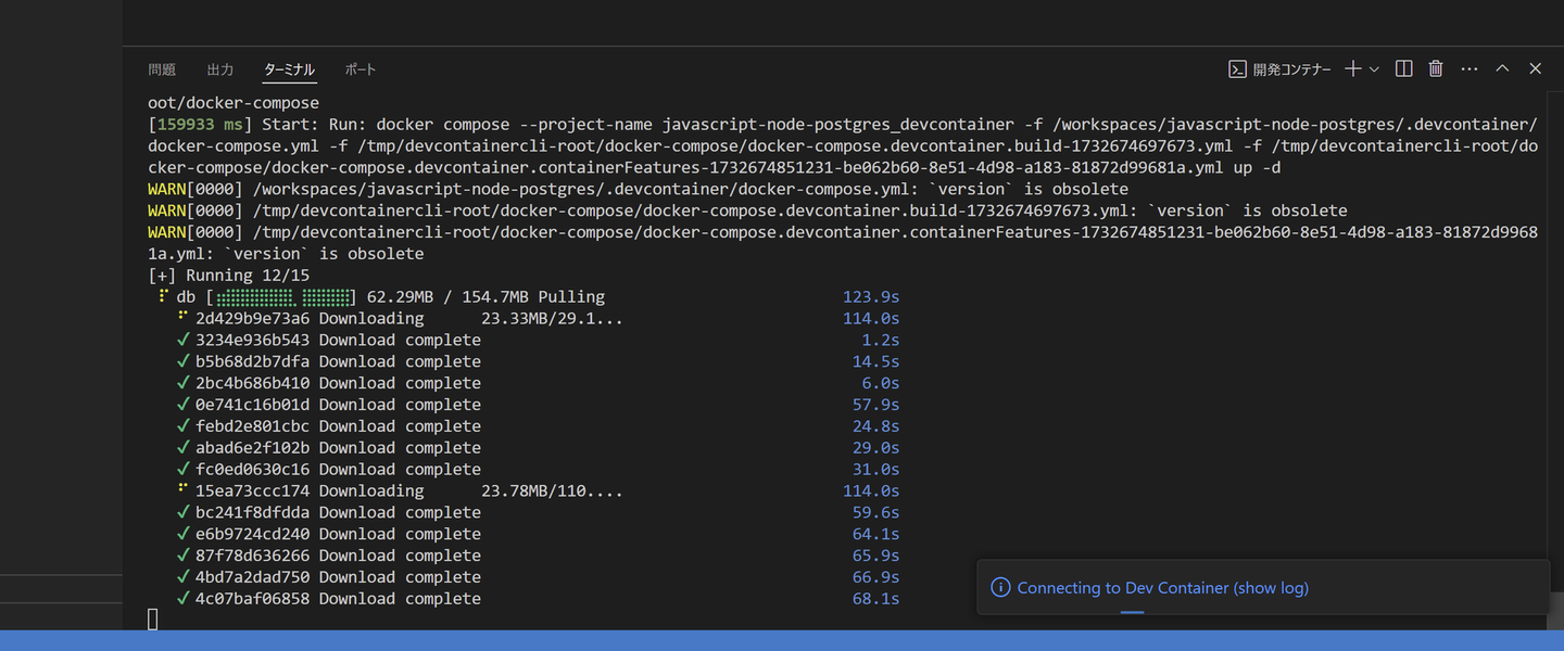 ネットワーク環境も影響するかもしれませんが、大体数分でコンテナ環境が準備できます。