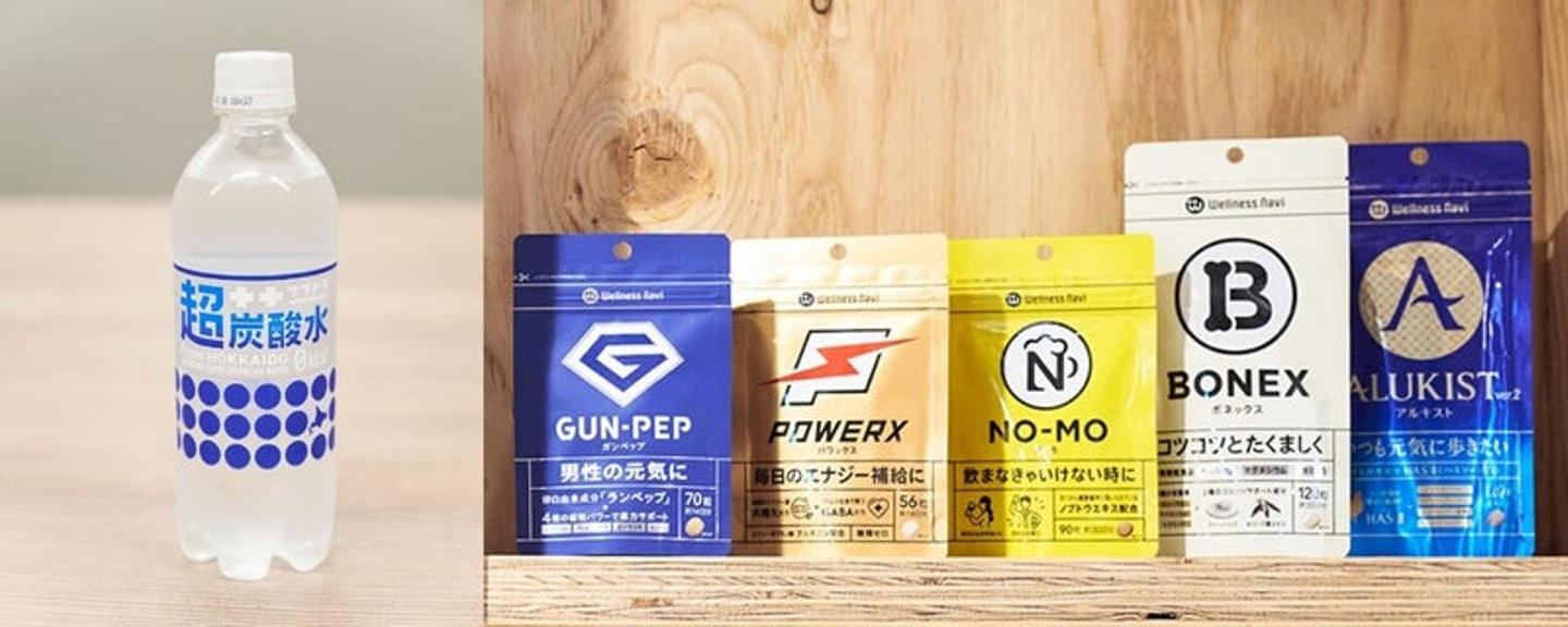 PB商品の開発も積極的に行う。炭酸の強い超炭酸水(左)や各種サプリなど人気商品が多数あり、高品質で低価格なものを洗練されたデザインで提供。