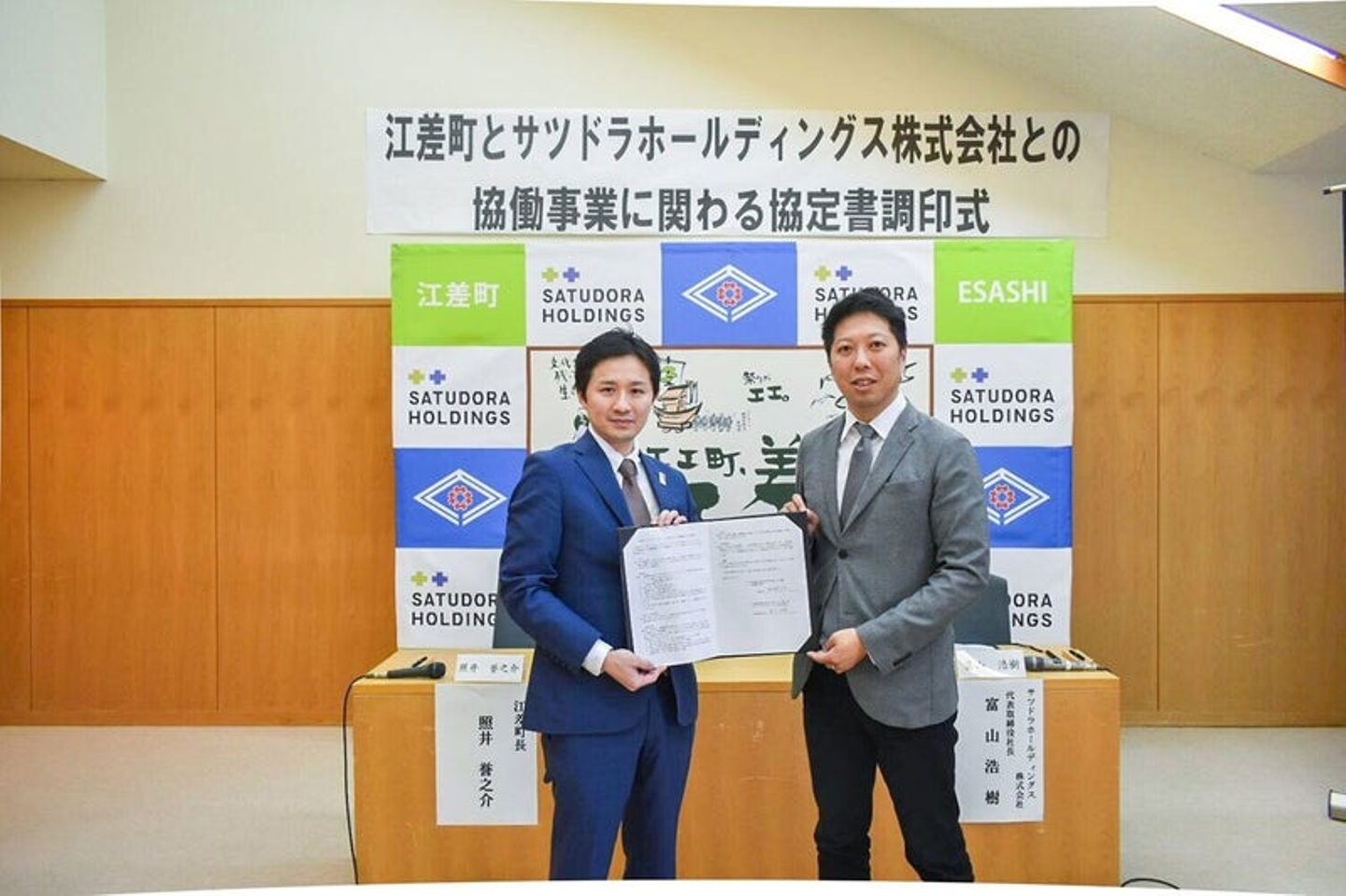 江差町と結んだ包括連携協定調印式の様子。左が照井町長、右が富山社長