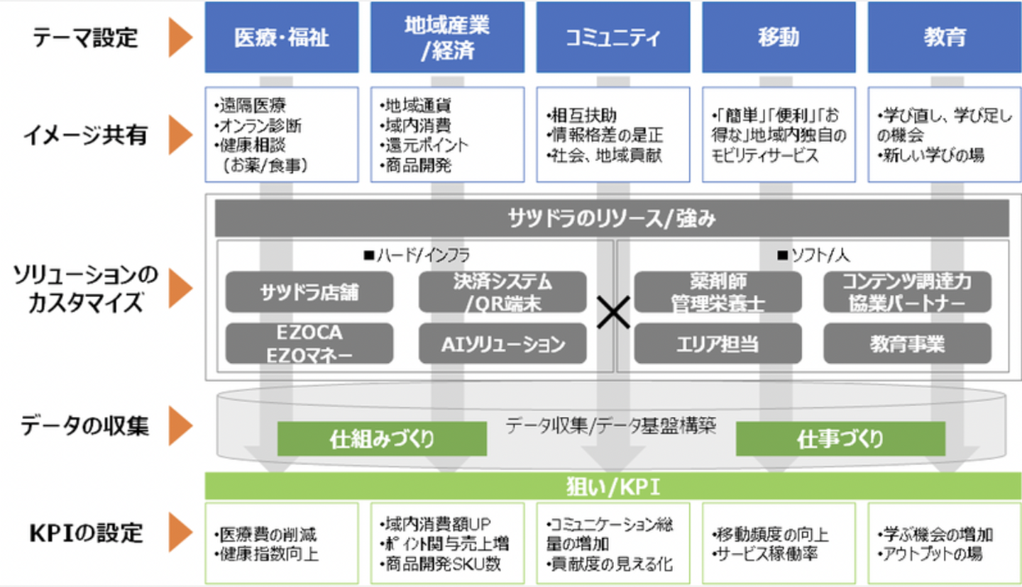 私たちは北海道という地域で多くの課題を解決するにあたり様々な構想を考えており、その手段として、これまでのドラッグストアだけの枠を超えた展開が必要だと感じ、「地域コネクティッドビジネス」というビジョンを掲げています。