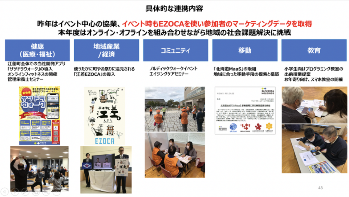 これらを軸としながら、江差町の課題(テーマ)を洗い出してもらい、その課題に合うサツドラグループの機能を掛け合わせ、最終的な姿(ゴール)を設定した上で、町の課題解決に向けて動き出しました。