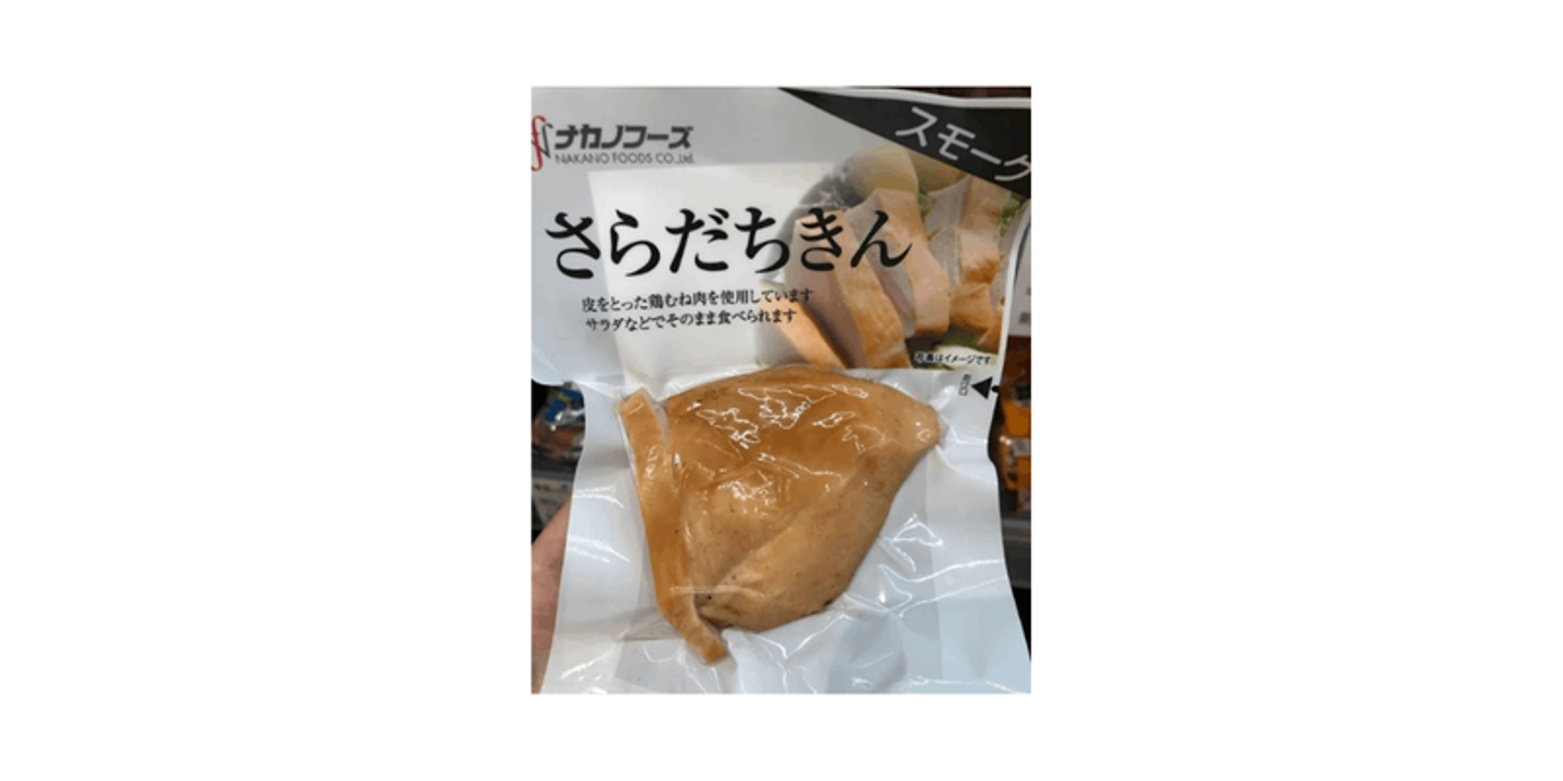 皆様もご存知のサラダチキンです。1切れあたりのたんぱく質は約23g、エネルギーは約112kcalです。