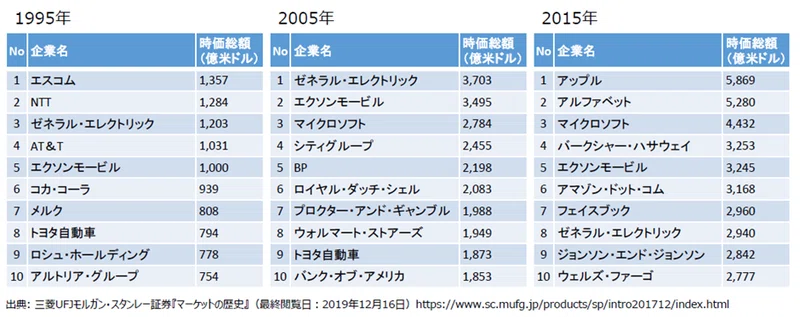 それは、インターネットが普及し世界で活躍するには、デジタルに関する知識が欠かせないからです。下の図の世界の企業時価総額ランキングの変遷を見ても分かる通り、アップルやマイクロソフト、アマゾン、フェイスブックなど、多くの企業がITに関連しています。今の世の中はテクノロジーのチカラが必須なのです。