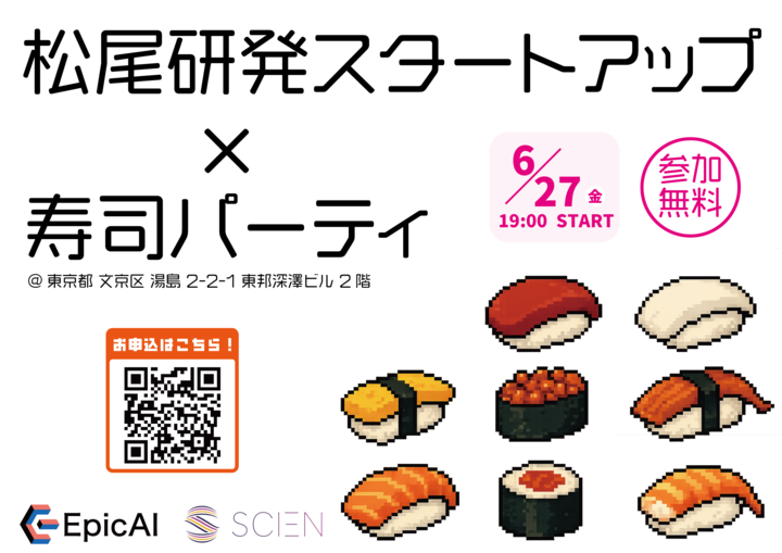 寿司パのビジュアルは、タイトルのフォントをAIっぽくプログラミング風にしたので、それに合わせる形で寿司の絵をドット絵に選びました!大体デザイン系のお仕事は最初は結構何も浮かばなくて困るんですけど、1個1個試してるうちに、なんか自分でなんとなくいいなって思ってくるものですね。寿司パの時もいくつか試して“しっくり来た”組み合わせに落ち着き、制作時間は4~5時間ほどでした。