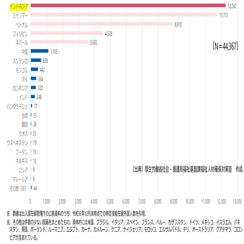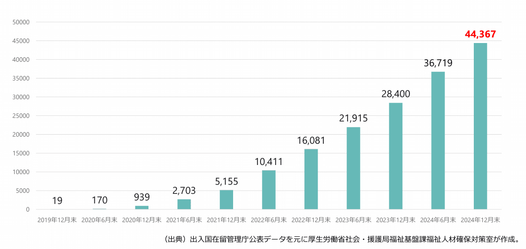 2019年末から2024年末にかけての特定技能介護分野における外国人材数の推移[4]。制度開始当初はごく少数だった在留者数が、5年間で急増し現在は約44,000人規模に達している。