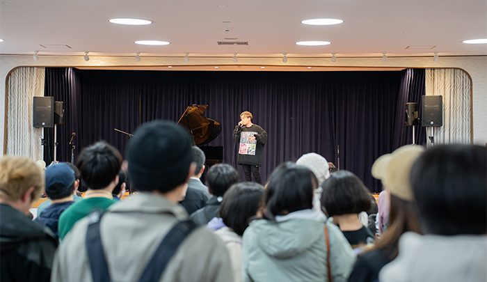 もう20歳からビートボックスを始めて それ1本で仕事としてやりながら世界中回ってきて、いま郡山でこうして活動させていただいています。今日はすごく幅広い世代の方がご来場してくださっていて、まさに「ごちゃまぜ」という感じですね。