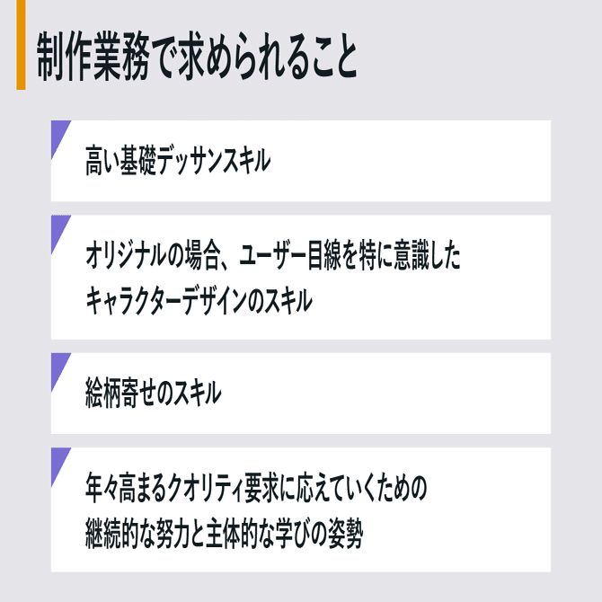 制作業務に関して、以下のようなスキル・考えが求められます。