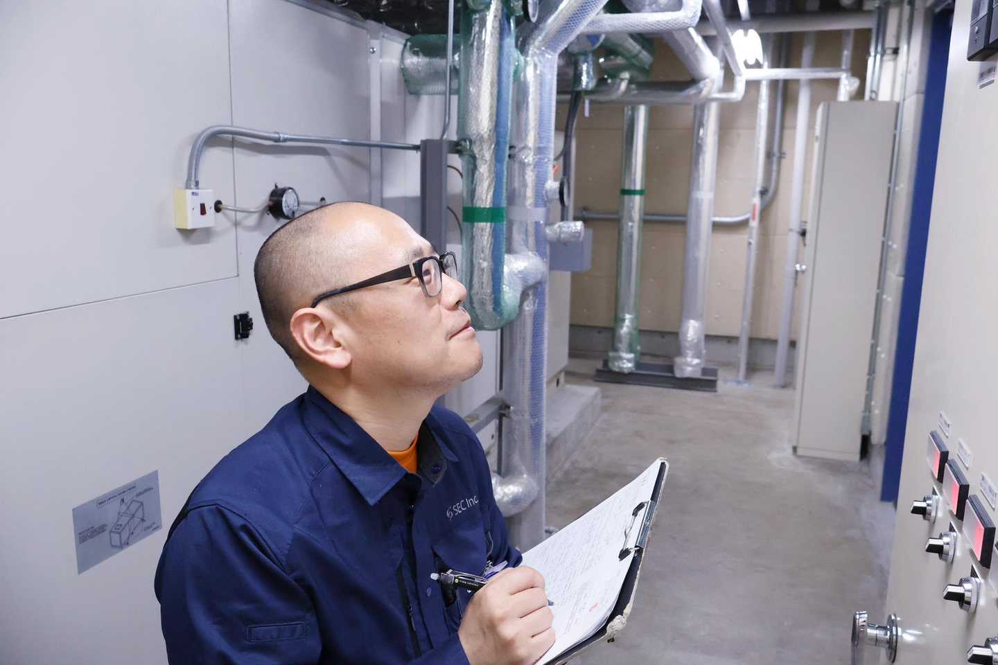 商業施設の開店後、電気・空調(エアコンなど)・熱源(ボイラーなど)といった主要設備のメーター数値の記録作業に向かいます。各設備で異常がないかなどを確認していきます。