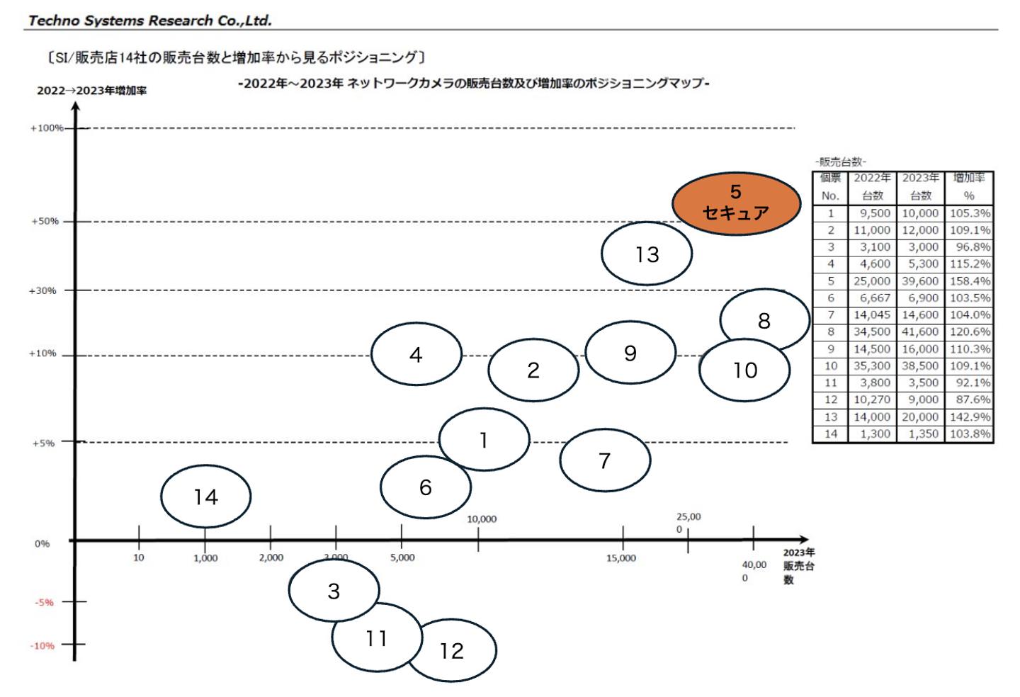 「SI/販売店14社の販売台数と増加率から見るポジショニング 」出典「2023年版 ネットワークカメラ国内市場のマーケティング分析」 ※社名を伏せるためにセキュアが一部改変