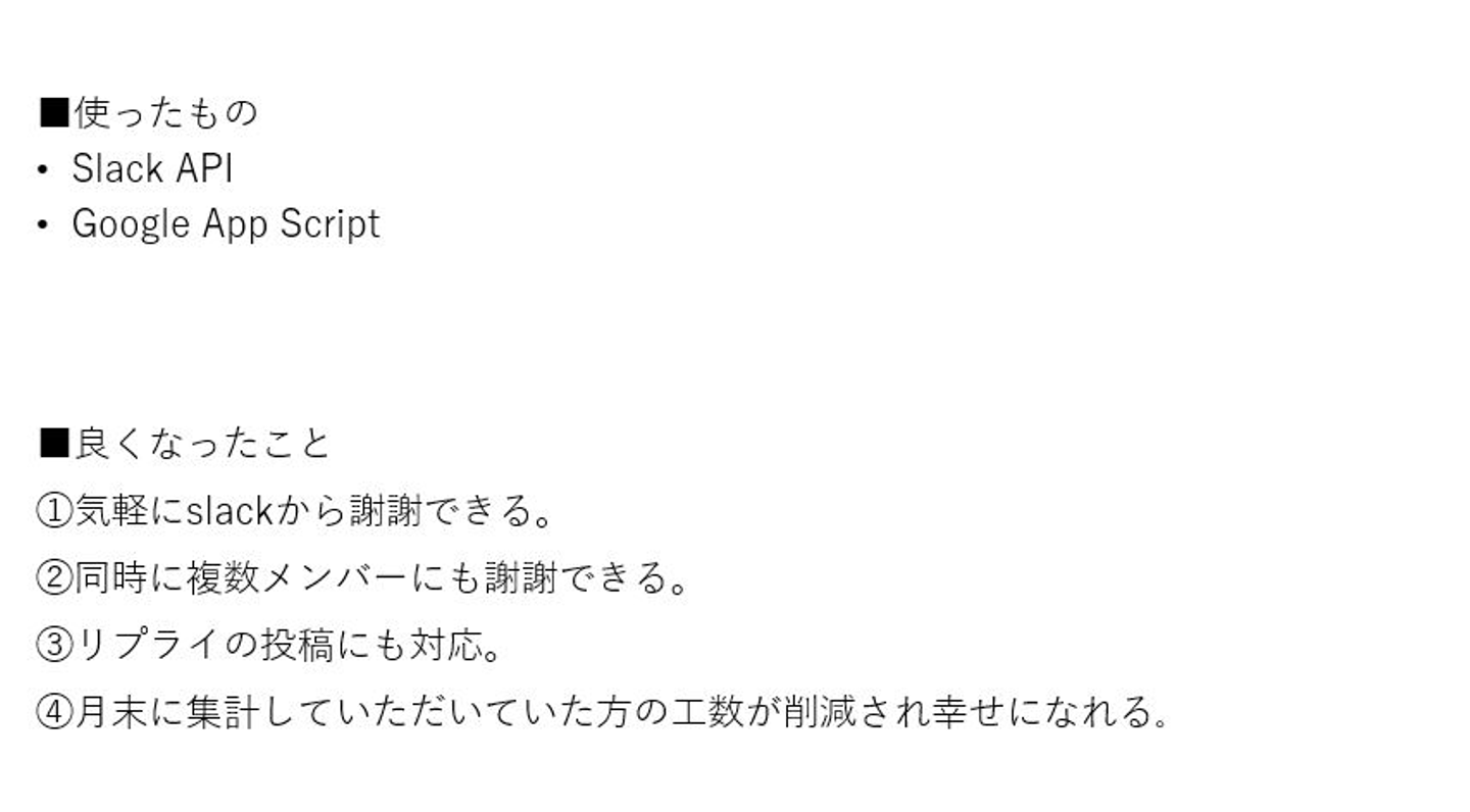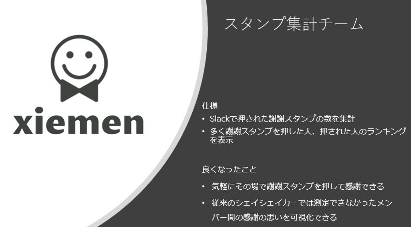 テーマは、「シェイシェイカー」という、感謝の気持ちをコメントにしてweb上で送りあう仕組みの改善。より使いやすくするためにslackで送りあう仕組みに進化させました。
