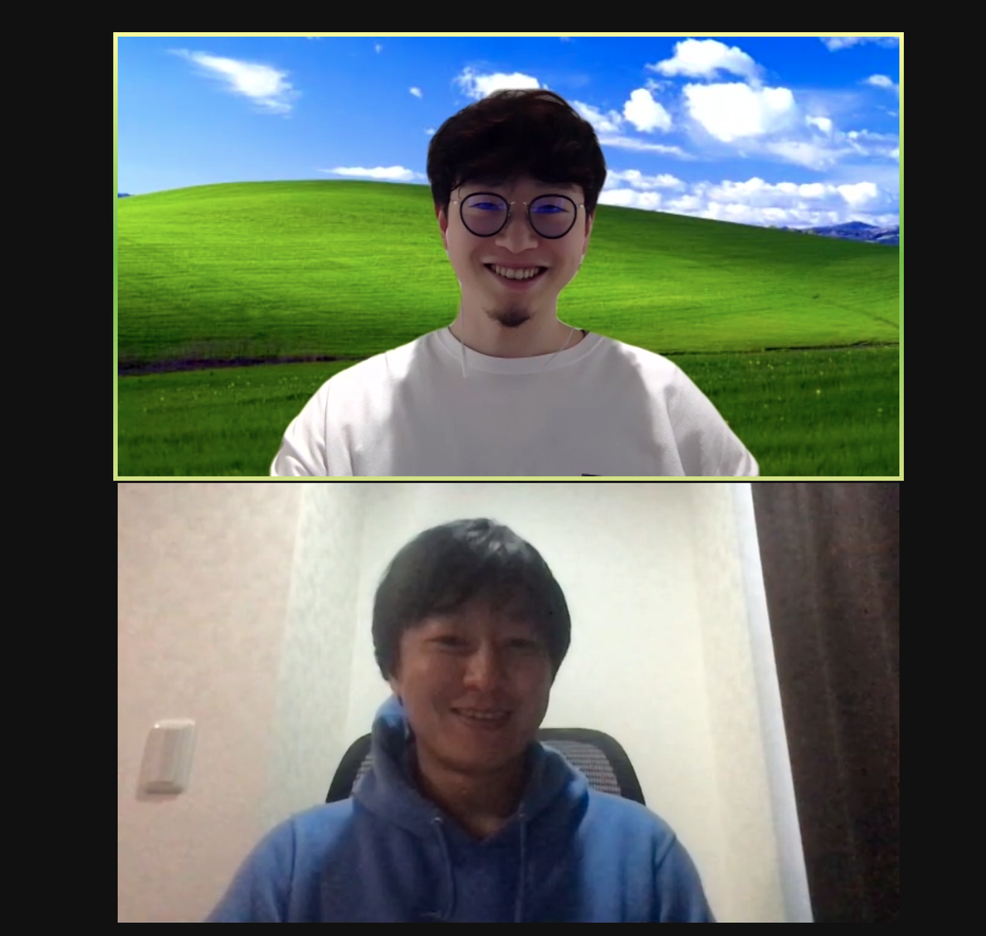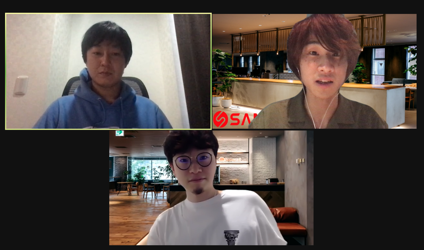 (画面左上:嶽、画面下:上田、画面右上:栗岡(インタビュアー))
