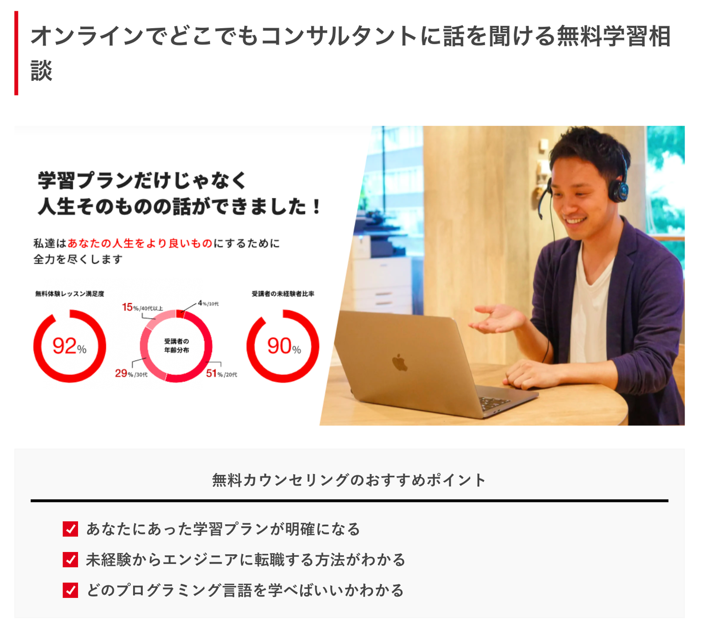 未経験でもご安心ください。無料学習相談をご利用される9割の方はプログラミング未経験です。まずは無料相談で、プロのコンサルタントにあなたの悩みや不安をお聞かせください!