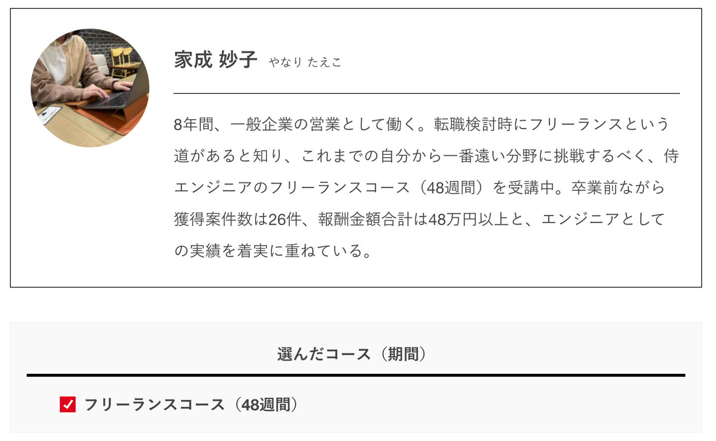 家成さん:私が調べた中で、侍エンジニアは他のスクール以上にフリーランスコースに力を入れている印象を受けたので、一番に無料体験レッスンの申し込みをしました。他のスクールも申し込もうかと思っていましたが、そのまま入塾を決めたため比較検討はしていません。