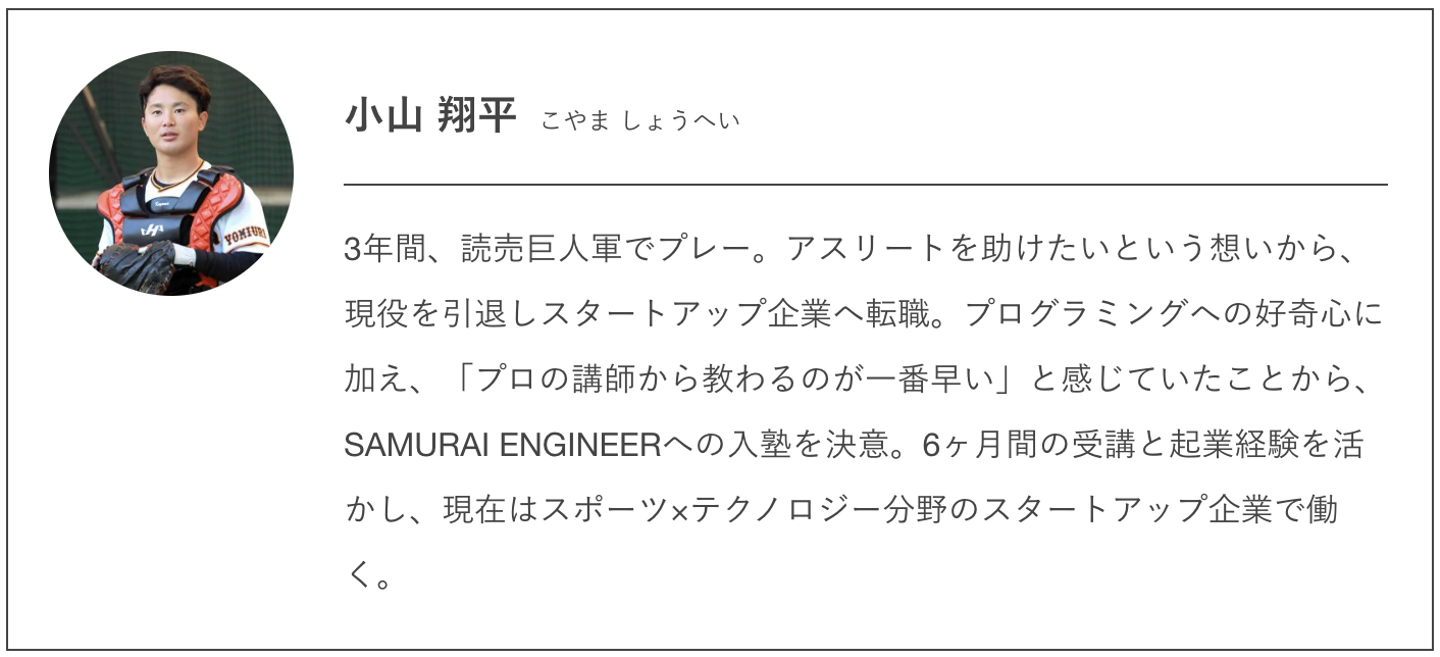 3年間、読売巨人軍でプレーした後「アスリートを助けたい」という思いから興した事業経験を経て、スポーツ×テクノロジー分野のスタートアップ企業に転職された小山さん。