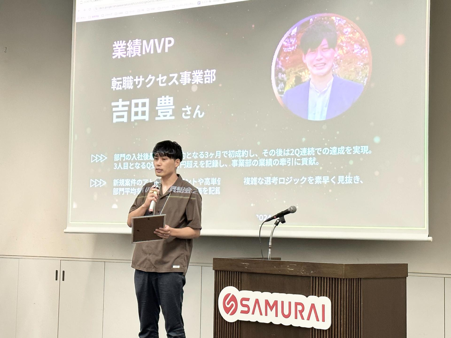 【受賞理由】転職サクセス事業部、SAMURAI入社後最速となる3カ月で初成約を達成!転職先の企業の複雑な選考ロジックを素早く見抜き、部門平均を120%上回る平均単価を記録しました。
