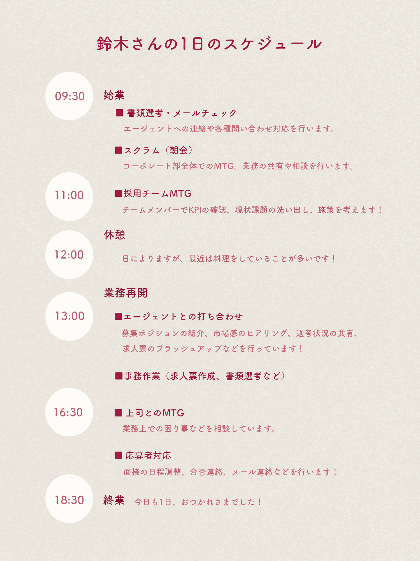 やりたいことの希望を聞いてくれるだけではなく、その上叶えてくれることです!現在は、新卒採用・中途採用の両方に携われていることに、とてもやりがいを感じています。業務を割り振られた上で、やりたいことを発信する機会は今までの会社でもありましたが、業務を振り分けられる前に、まず「どんなことに挑戦してみたいのか」を聞いてくれることがとても新鮮で、自分自身のモチベーションと更に成長していきたいという想いにも繋がっています。