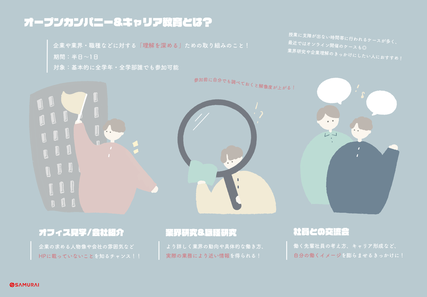 「オープン・カンパニー&キャリア教育」とは、企業や業界・職種などに対する「理解を深める」ための取り組みのこと。オフィス見学をはじめ、業界研究や職種研究、社員との交流会など、入社後のキャリアイメージを膨らませられるようなプログラムが組まれています。