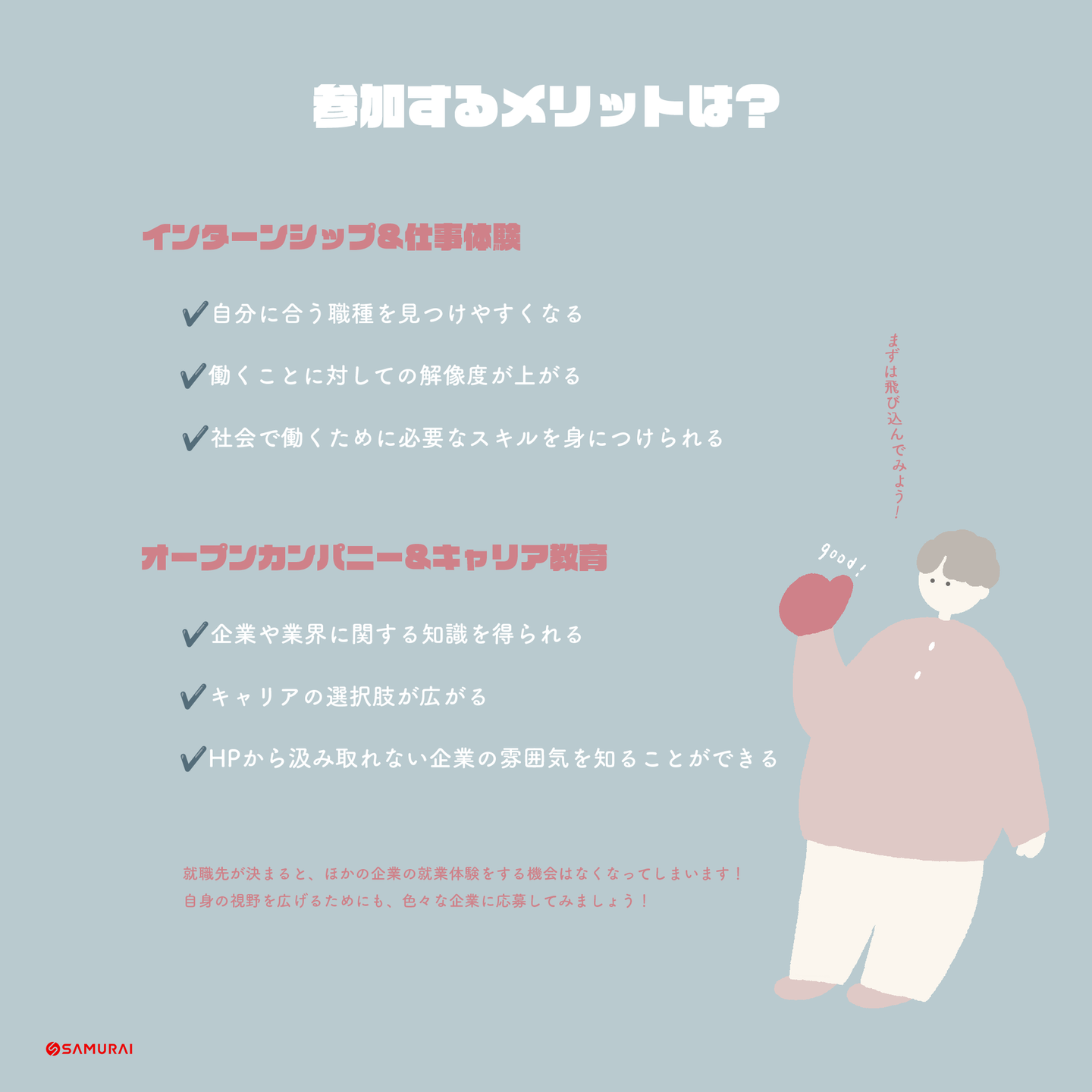 すでに行きたい業界や興味のある職種がある程度決まっていて、実務を知りたい人は「インターンシップ&仕事体験」へ。さまざまな会社について知りたい、これから興味を広げていきたい人は「オープン・カンパニー」を活用してみましょう◎
