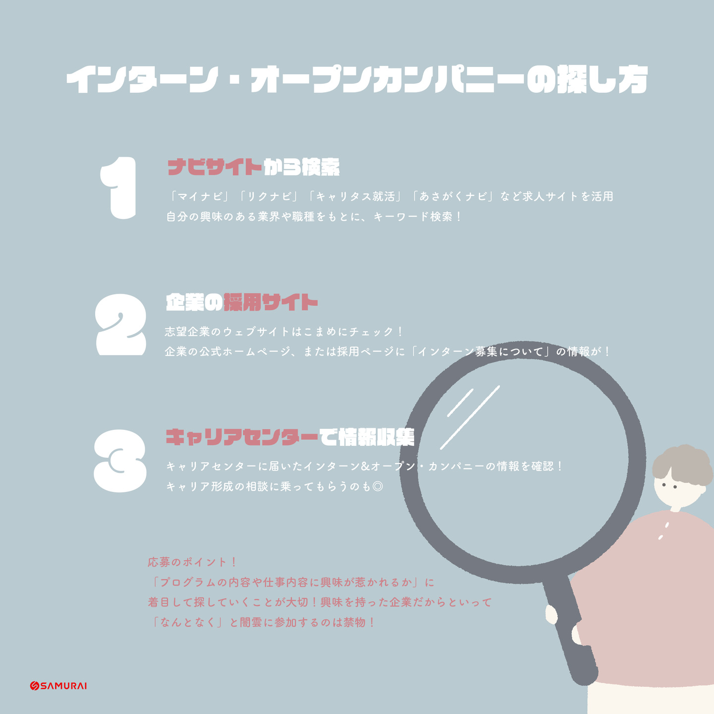 気になる企業の公式ホームページ、または採用ページに「インターン募集について」の情報が掲載されている可能性があります。志望企業のウェブサイトはこまめにチェックしてみてください!