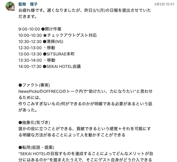 また、その日1日の学びを社内に共有する”日報”という制度も、重要な言語化の機会でした。一般的な業務報告を目的としたものとは違い、ただの気づきや学びに加え、それらを抽象化し他の業務や活動に転用するため、どんな事象にもなぜ?と問いかけ、物事の本質を見つける必要がありました。