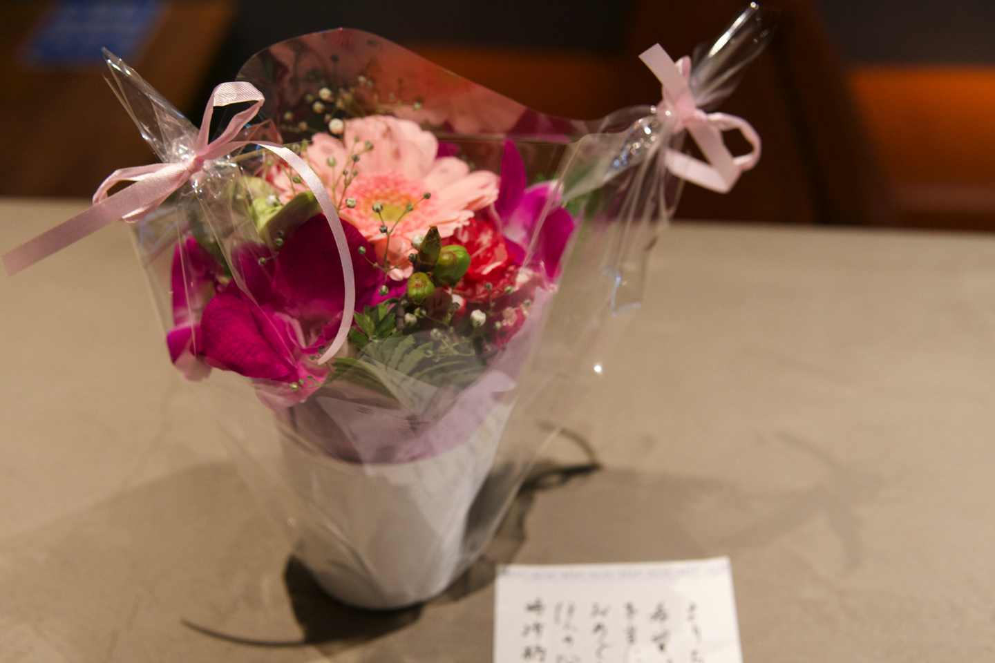 ▲カフェのママさんから貰った入社祝いのお花と手紙