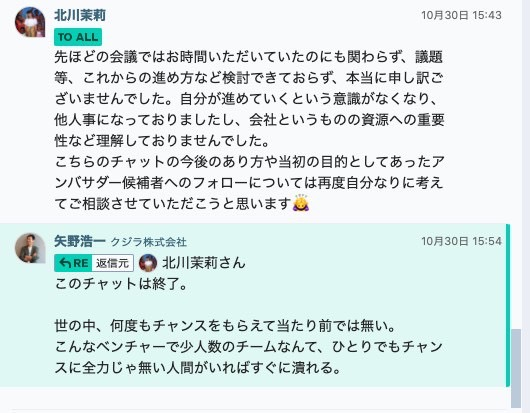 その後、次の機会があることを前提に反省文と謝罪のコメントを書いたのですが、「世の中何度もチャンスをもらえて当たり前ではない」と言われ、そのチャットもなくなり、甘い考えだったなと意識を改めさせられた機会でした。