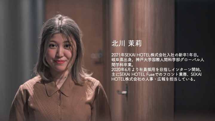 今回のインタビューは2020年4月に新卒入社でSEKAI HOTEL株式会社の仲間入りをした北川茉莉さん。国際協力学生団体や地域活性化事業での活動、社会支援の会社でのインターンを経験したのち、SEKAI HOTEL長期インターンを経て入社した茉莉さんにインターン時代のSEKAI HOTELでチャレンジしたことや社員になってからの心情の変化など前後編で伺いました。