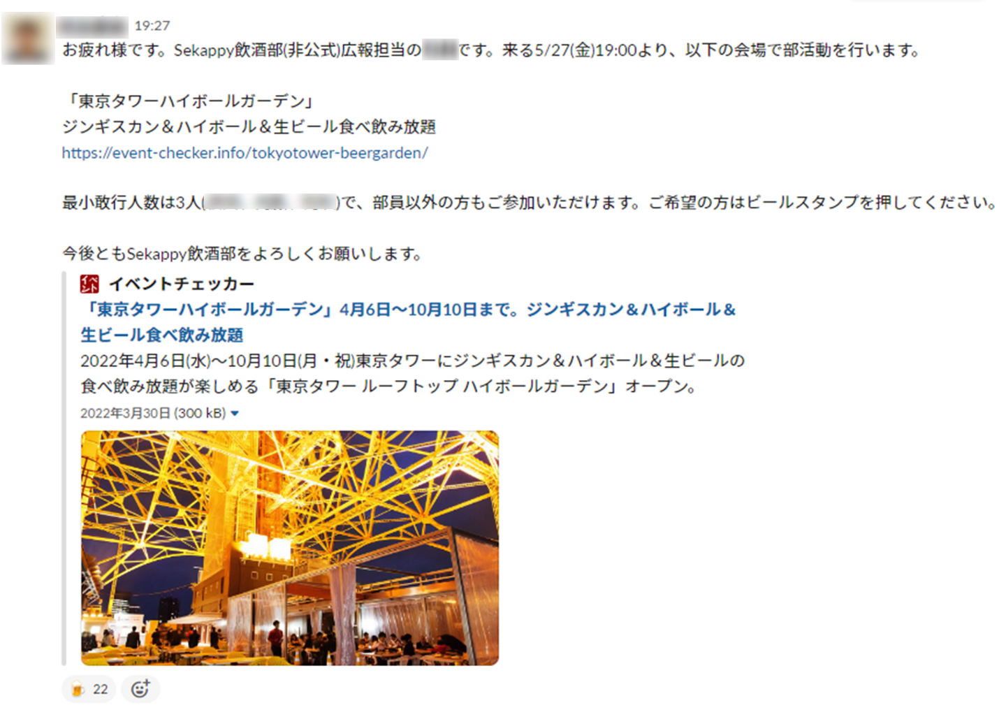 また、飲酒部という非公式の部活動もSekappyには存在しており、たびたびこのチャンネルで参加者を募っています。定期的な活動は勿論のこと、新しくオープンしたり、話題になっているお店やビアガーデン等にも積極的に足を運んでいます!