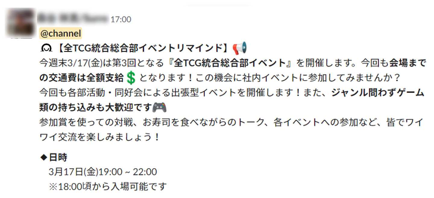 このチャンネルは、IT勉強会や毎月のTCG総合イベントの告知や各部活動の告知がされます。それぞれのイベントへの参加表明は、このチャンネルでのスタンプで気軽に行うことができます!