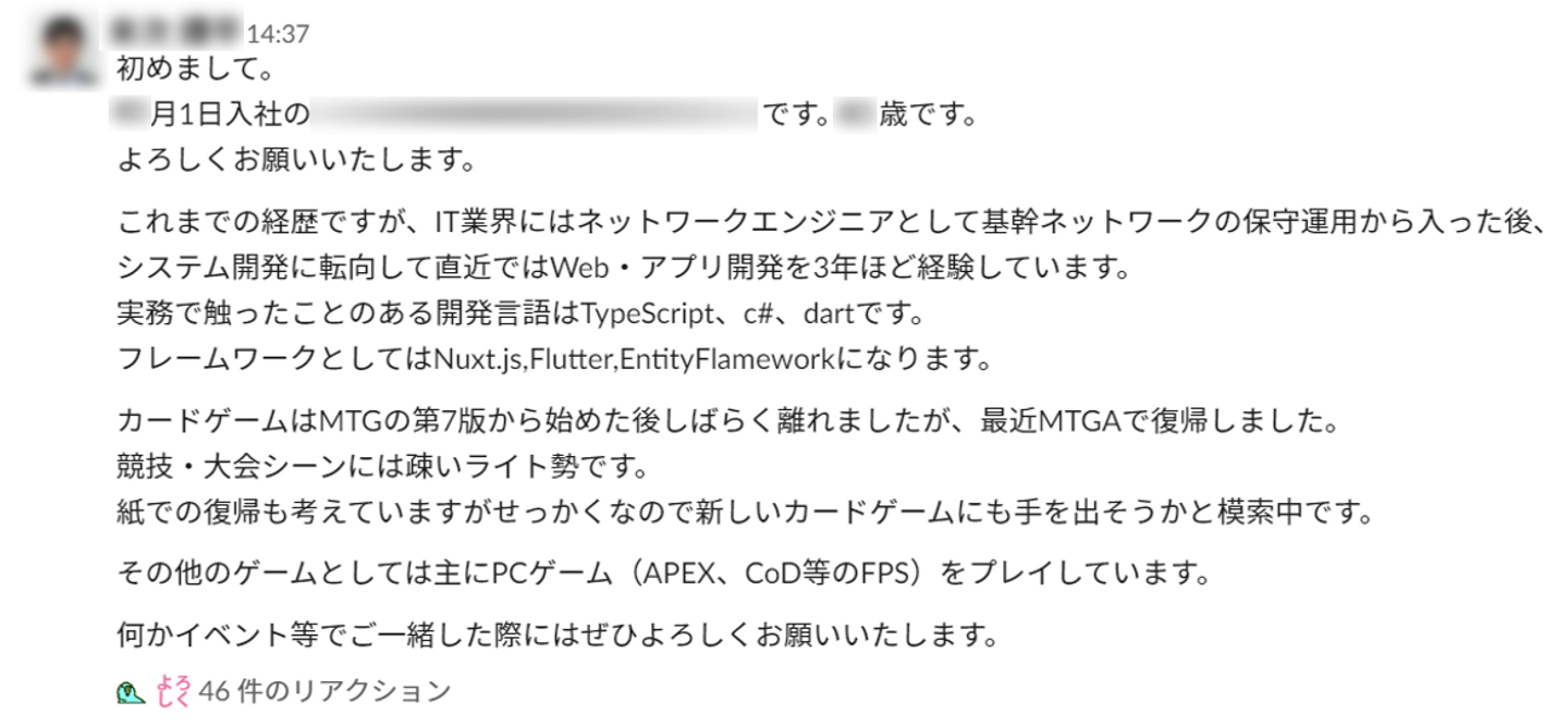 自己紹介には何十個もの歓迎スタンプが押され既存社員が大歓迎してくれます。