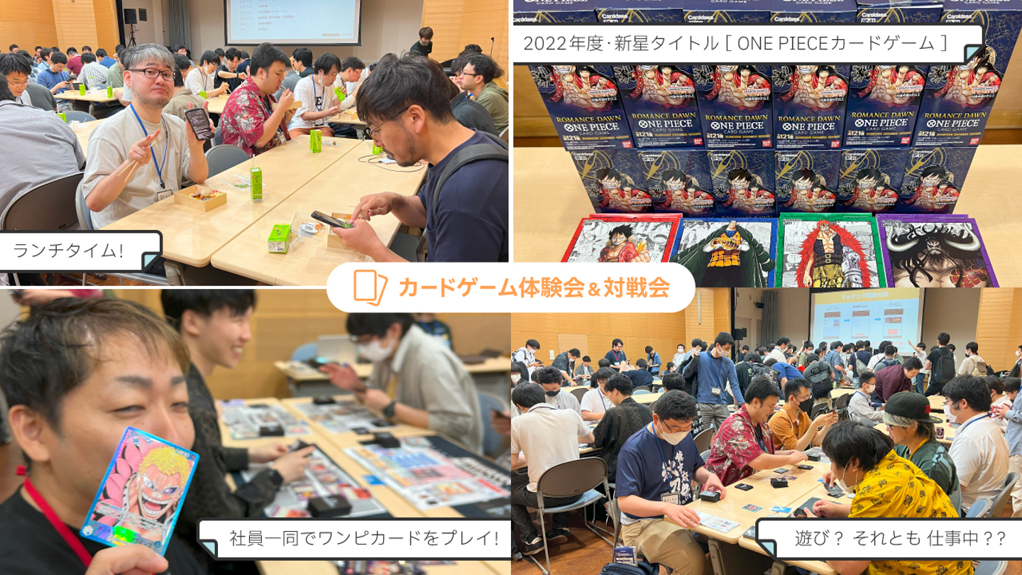 午後の部を迎え、まずは「カードゲーム体験会&対戦会」として、さきほどの勉強会でも取り上げられた2022年度・新星タイトルのひとつ、ONE PIECEカードゲームを社員一同で遊び、学び、交流しました。