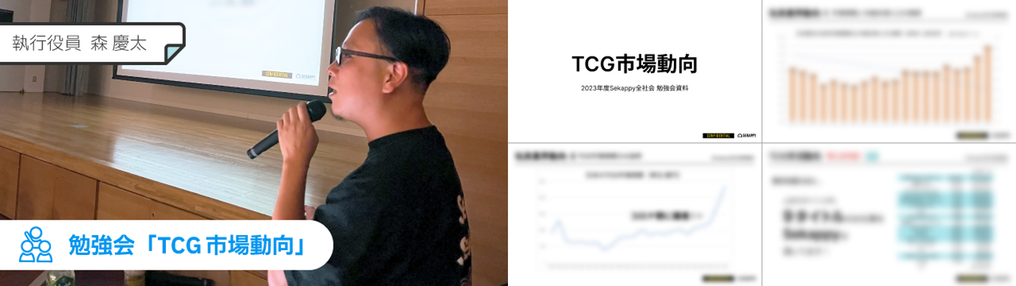 続いて、不肖わたくし森を講師として、「TCG市場動向」と銘打った社員向け勉強会を開催しました。「社員全員がカードゲーマー」であるSekappyは、ありがたいことにカードゲーム関連のさまざまなお仕事をいただいており、今般、専門の事業部としてTCG事業部を新設するほどになったというところで、今回は国内外のカードゲームの動向を勉強会のテーマとさせていただきました。