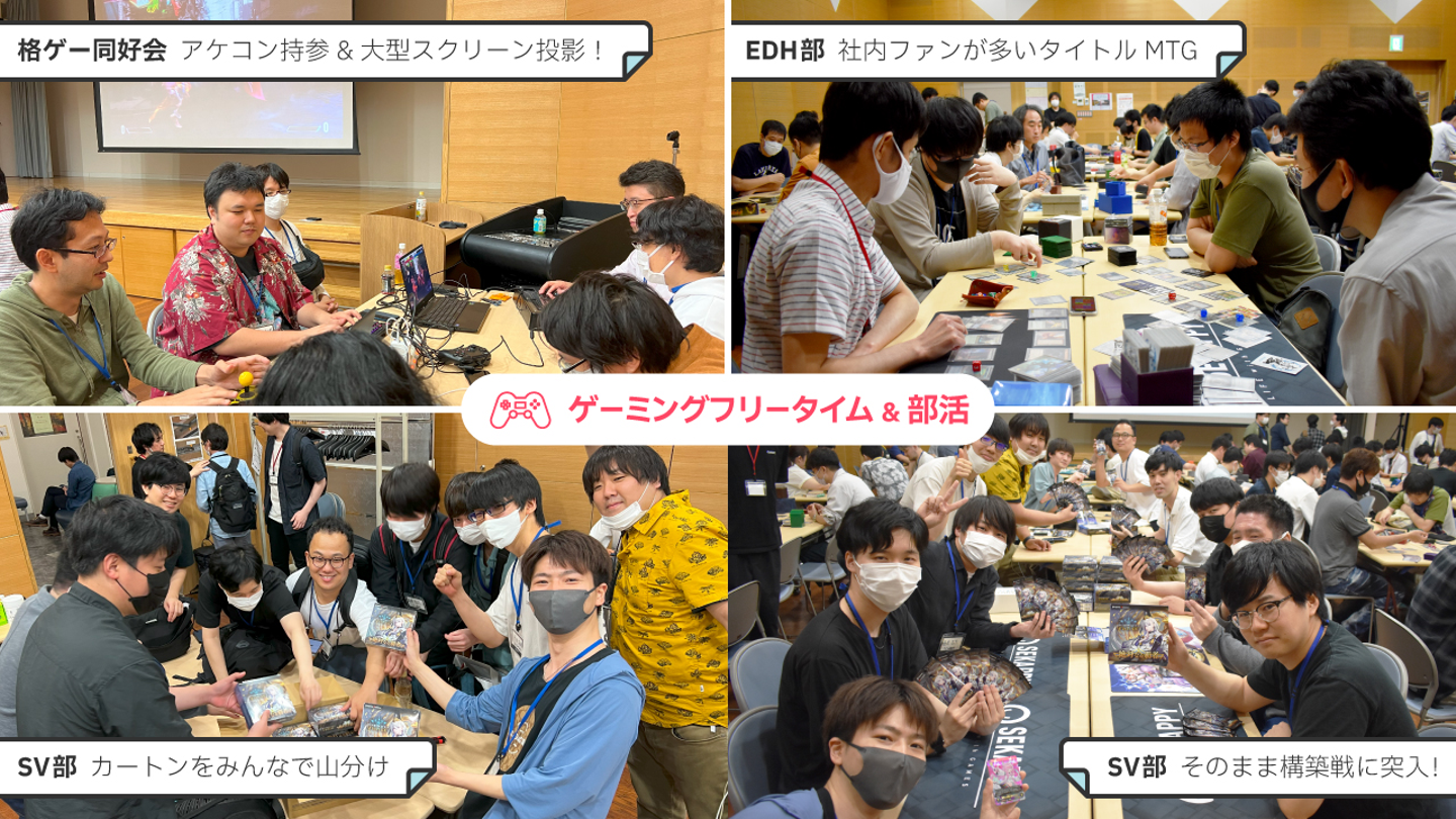 創業時からもっとも社内ファンが多いタイトルであるマジック:ザ・ギャザリングについては様々な社内部活動があるのですが、SekappyではEDH部(集団戦となる変則ルール『統率者戦』を楽しむ部活)の活動が特に目立ちます! この会場でも対戦会が盛り上がっていますが、会社から支給される部費を活用し、温泉付きの宿泊施設を貸切っての合宿旅行企画なども定期的に開催されています。