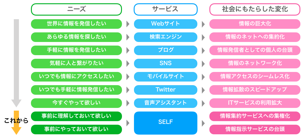 SELFでは、「私を理解して、先周りしてやっておいて欲しい」というニーズに答えるサービスが求められていると考えています。