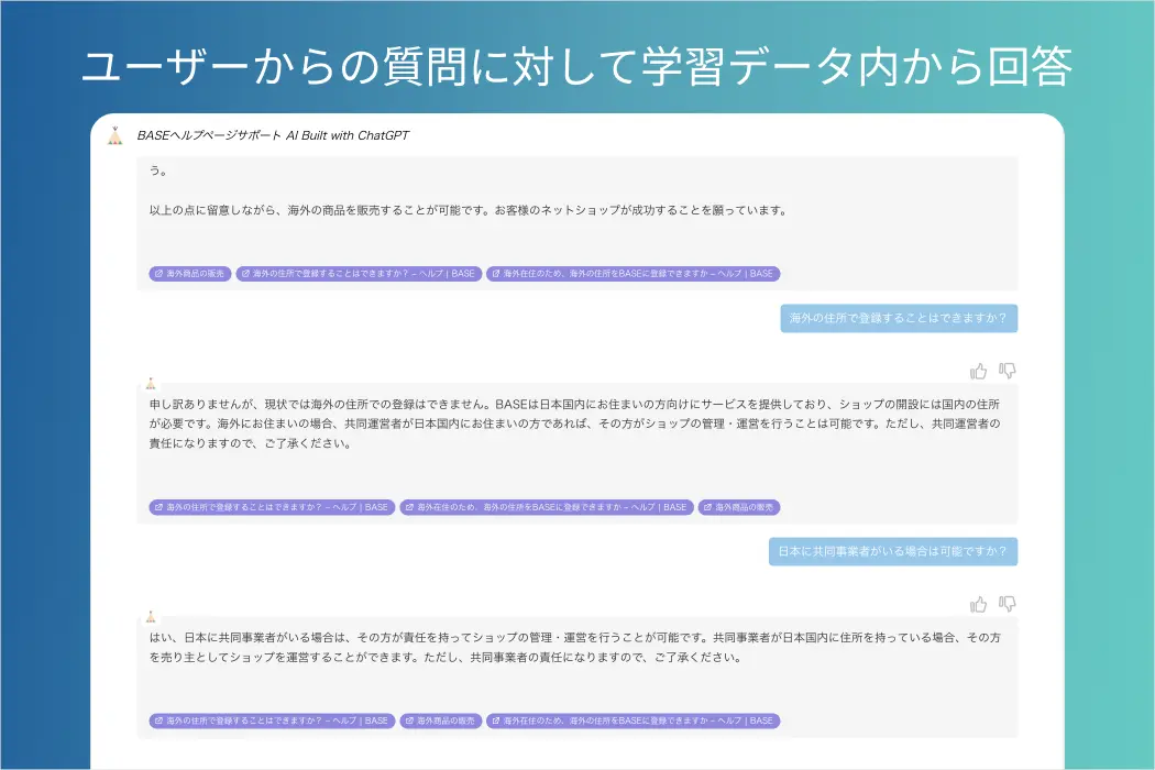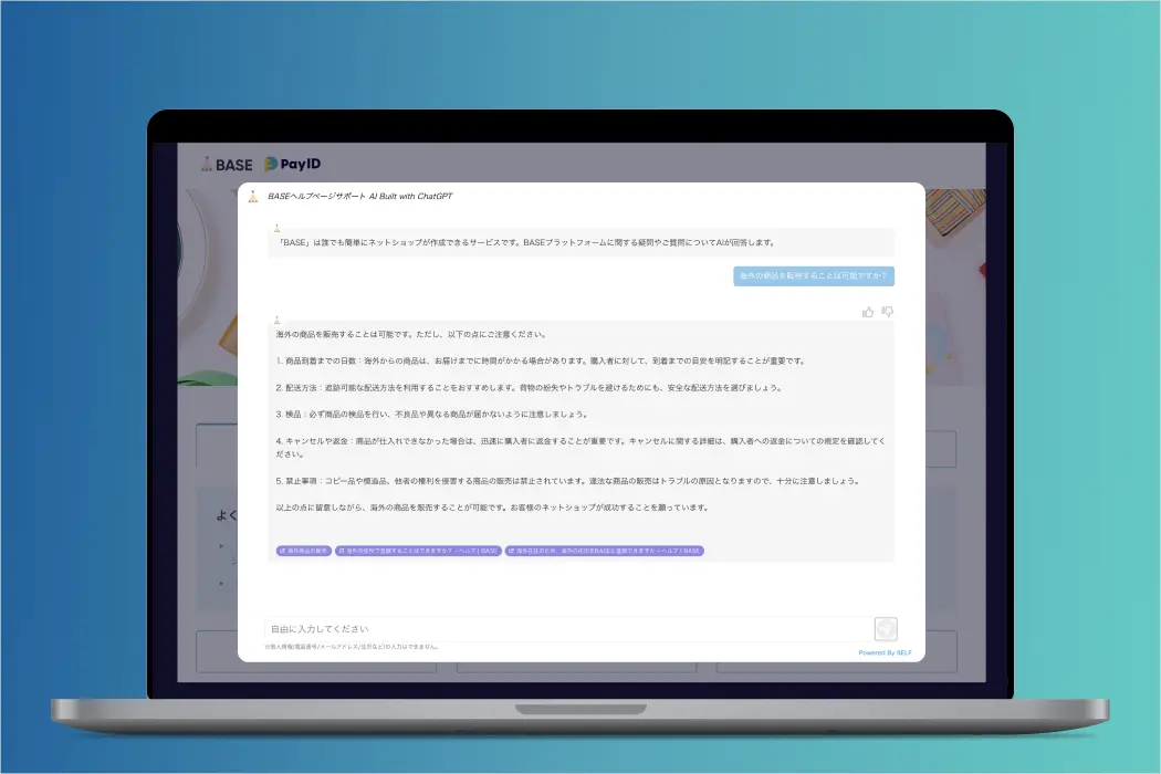 ChatGPTとの相互連携システム「SELFBOT」が、BASE株式会社が運営するネットショップ作成サービス「BASE(ベイス)」と購入者向けショッピングサービス「Pay ID(ペイ アイディー)」のWebヘルプページに導入されました。