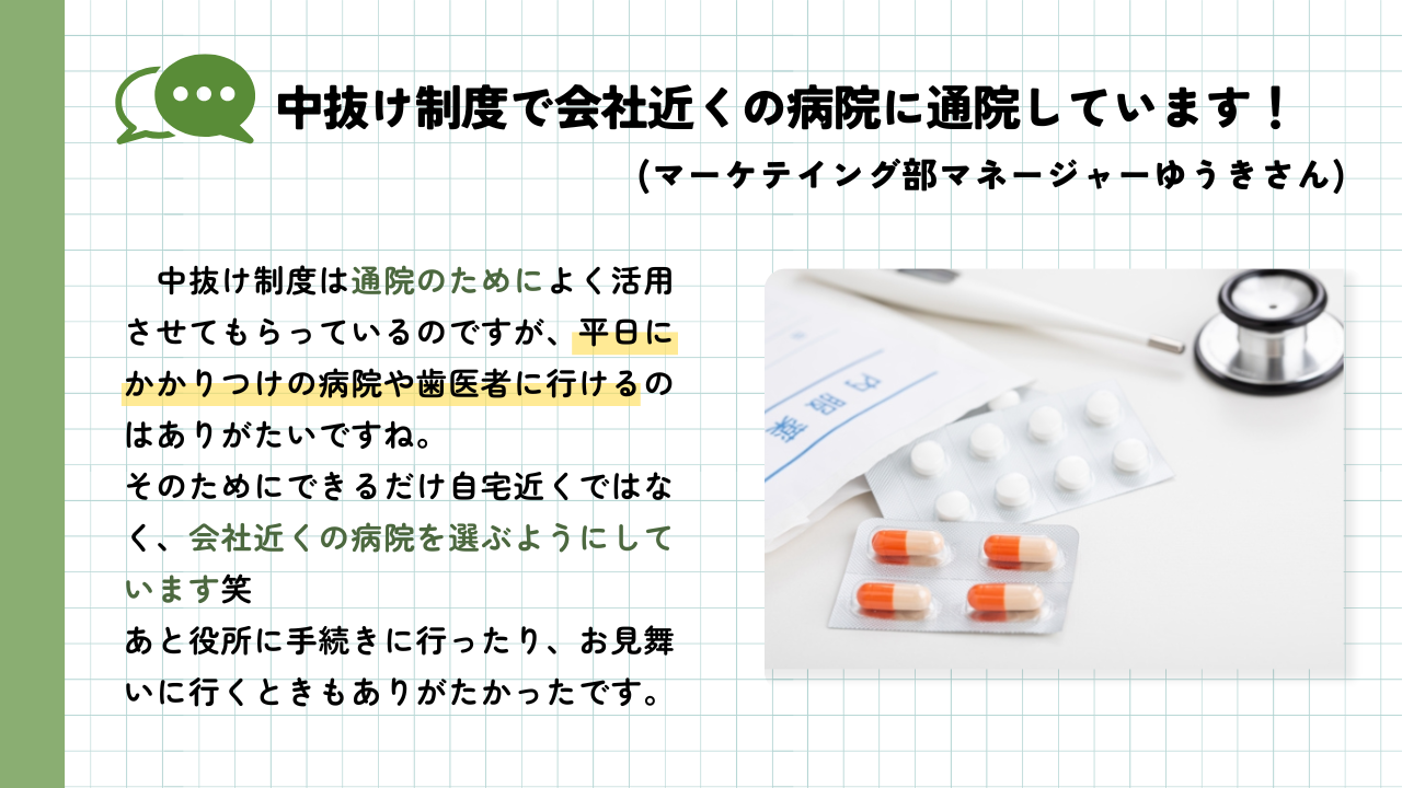 中抜け制度は勤務時間中に個人的な用事(通院・役所手続きなど)を済ませるために離席ができる制度で、中抜けした分の時間は退勤時間である18時30分以降に通常勤務として働けばOKです。