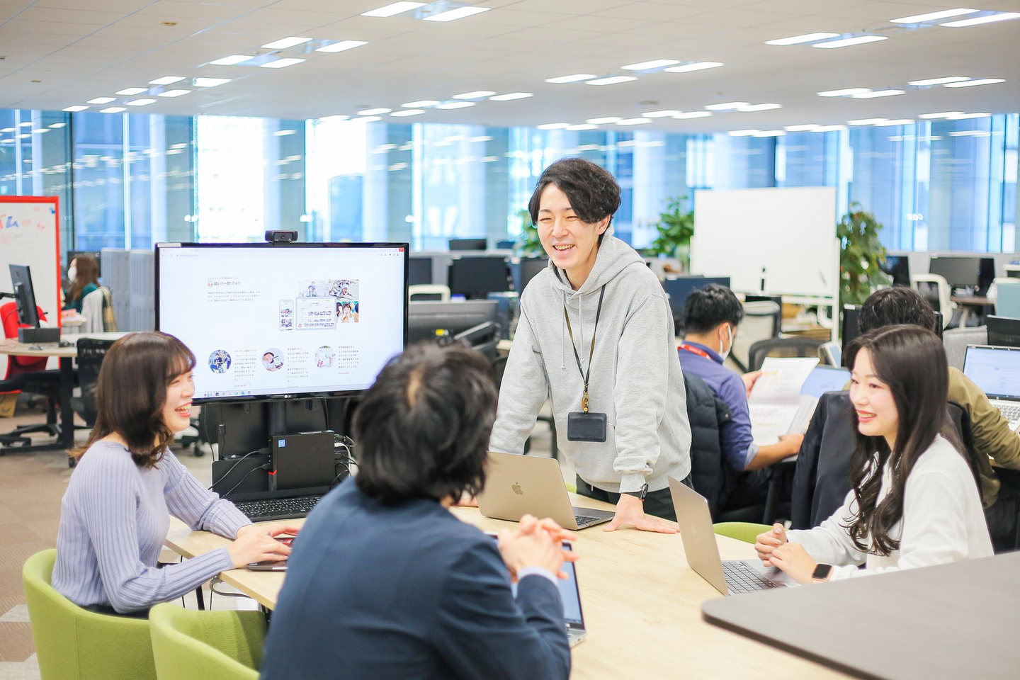 朝会をしたり、1オン1をしたり、ランチをしたり、自由度高く使えるスペースです。