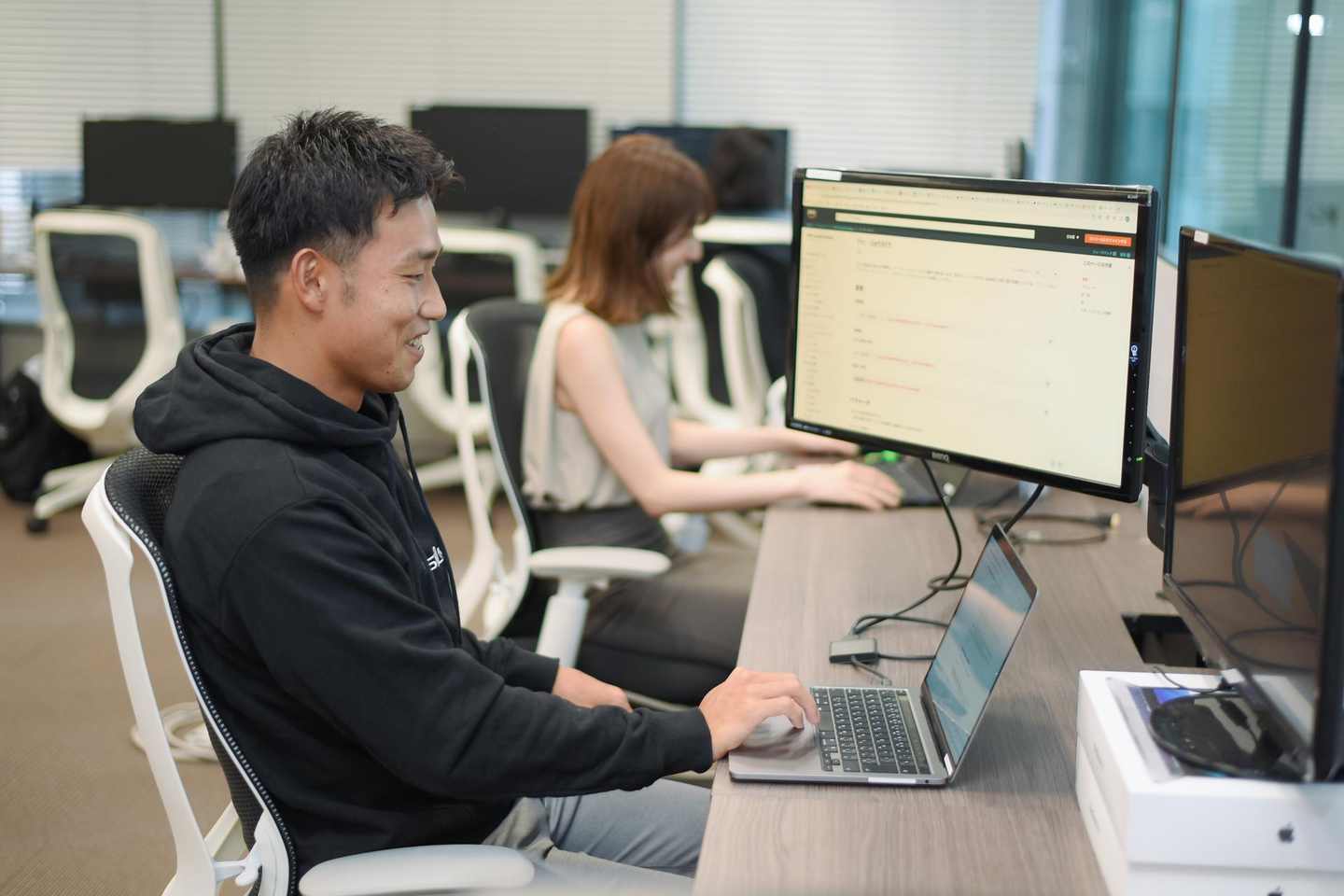 以前はエンジニア、コーポレート、各事業部とエリア分けされており固定の席があったのですが、フリーアドレスの導入により、部署間の壁が無くなり、個人の働き方に合わせて自由に場所を選べるようになりました。