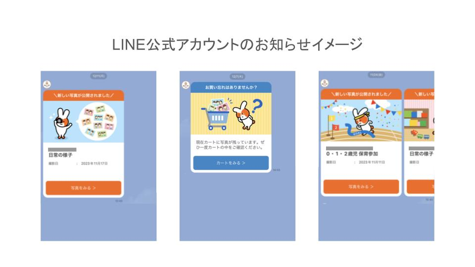 お客様はどのようなタイミングでどのような通知がどのようなデザインで何回くらい届くのがいいのか、どのように導入説明をするのか、分析のためにどんな項目が必要かなど、プロジェクトメンバーと意見を出し合って議論したり、過去の分析データをもとにして固めていきました。子どもたちの写真を見るのを毎回楽しみにしていただけるように、LINEの通知メッセージでは公式キャラクターのピースラビットを使ったバリエーションがあるデザインにしております。