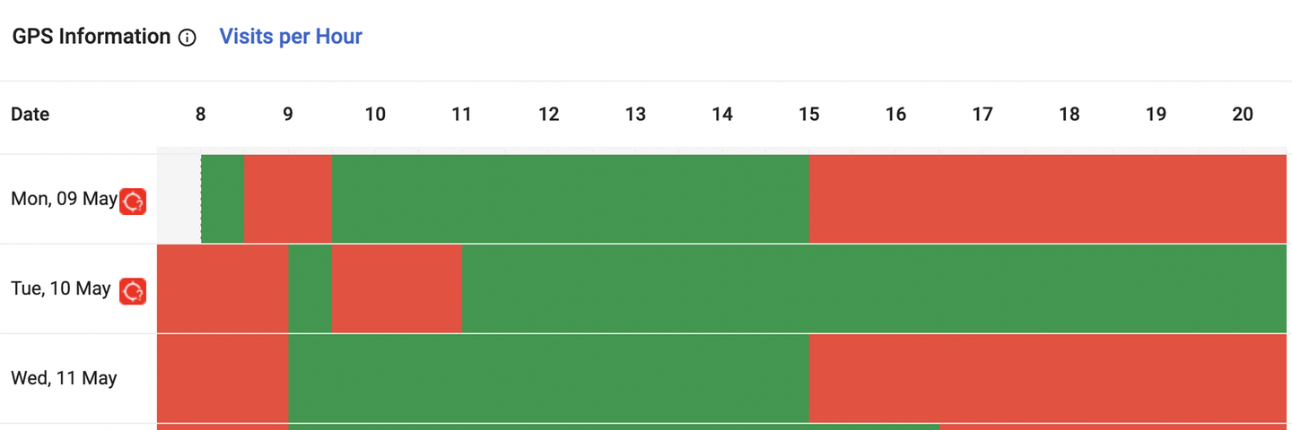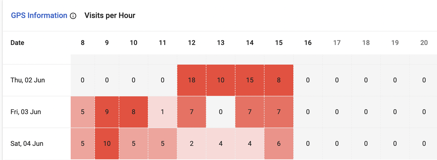 営業スタッフが1時間ごとに何件の顧客を訪問しているかを可視化。1時間毎の件数が多い場合は、一箇所で偽の訪問を作っている可能性あり。